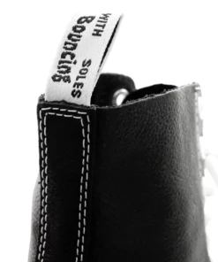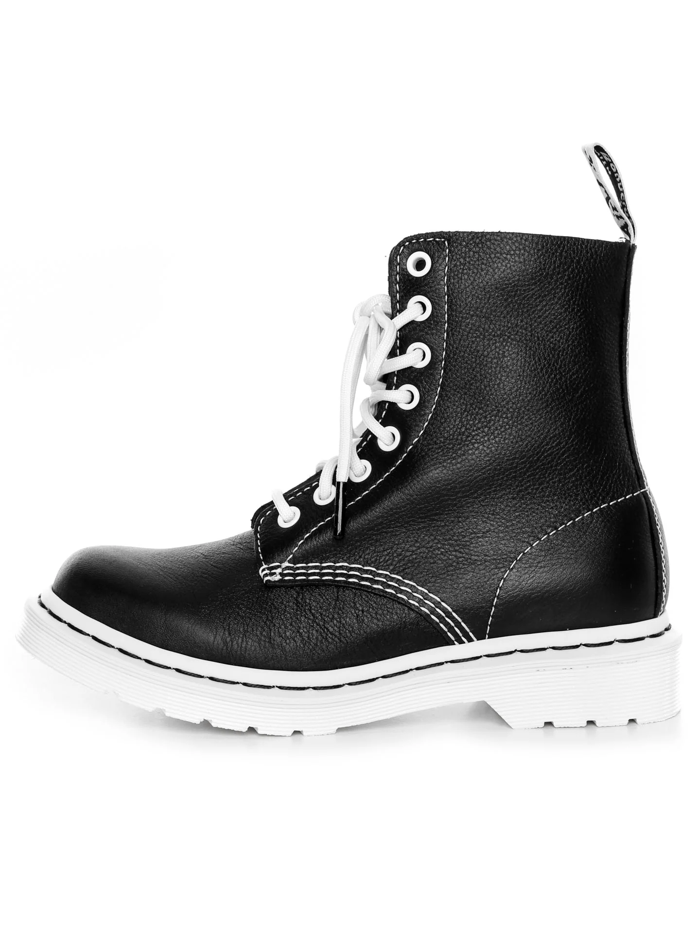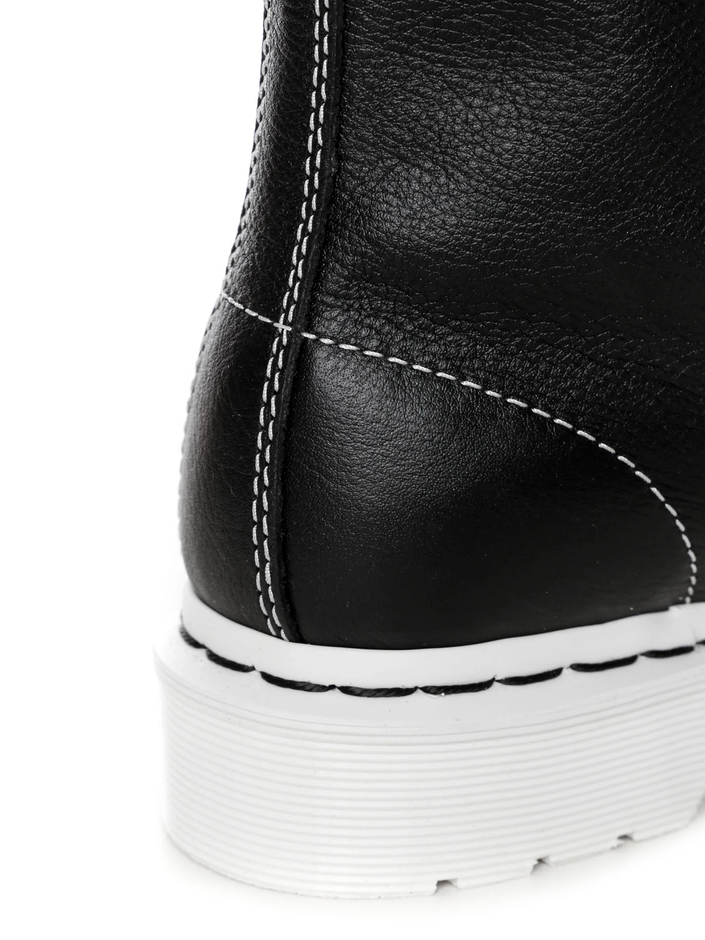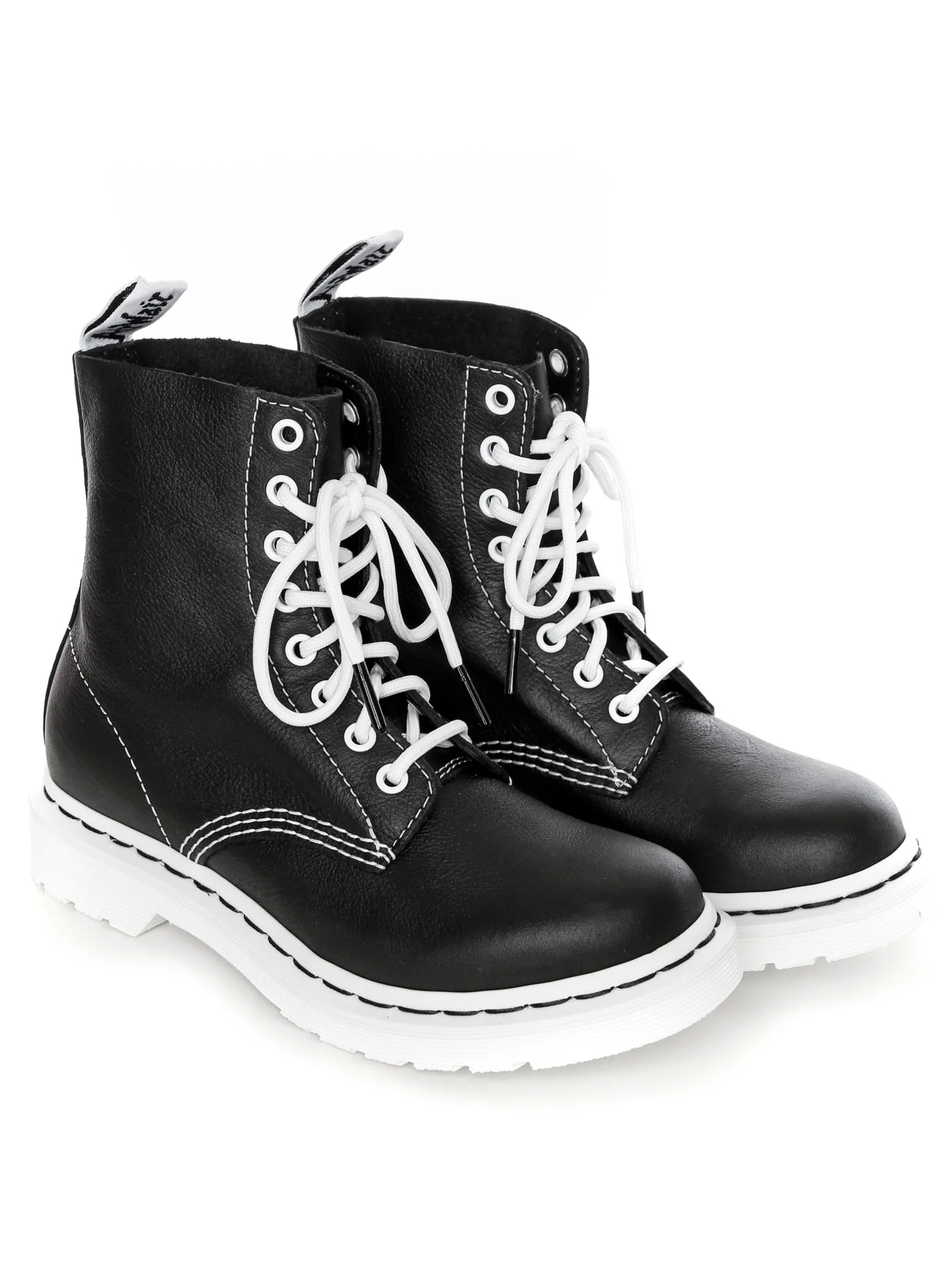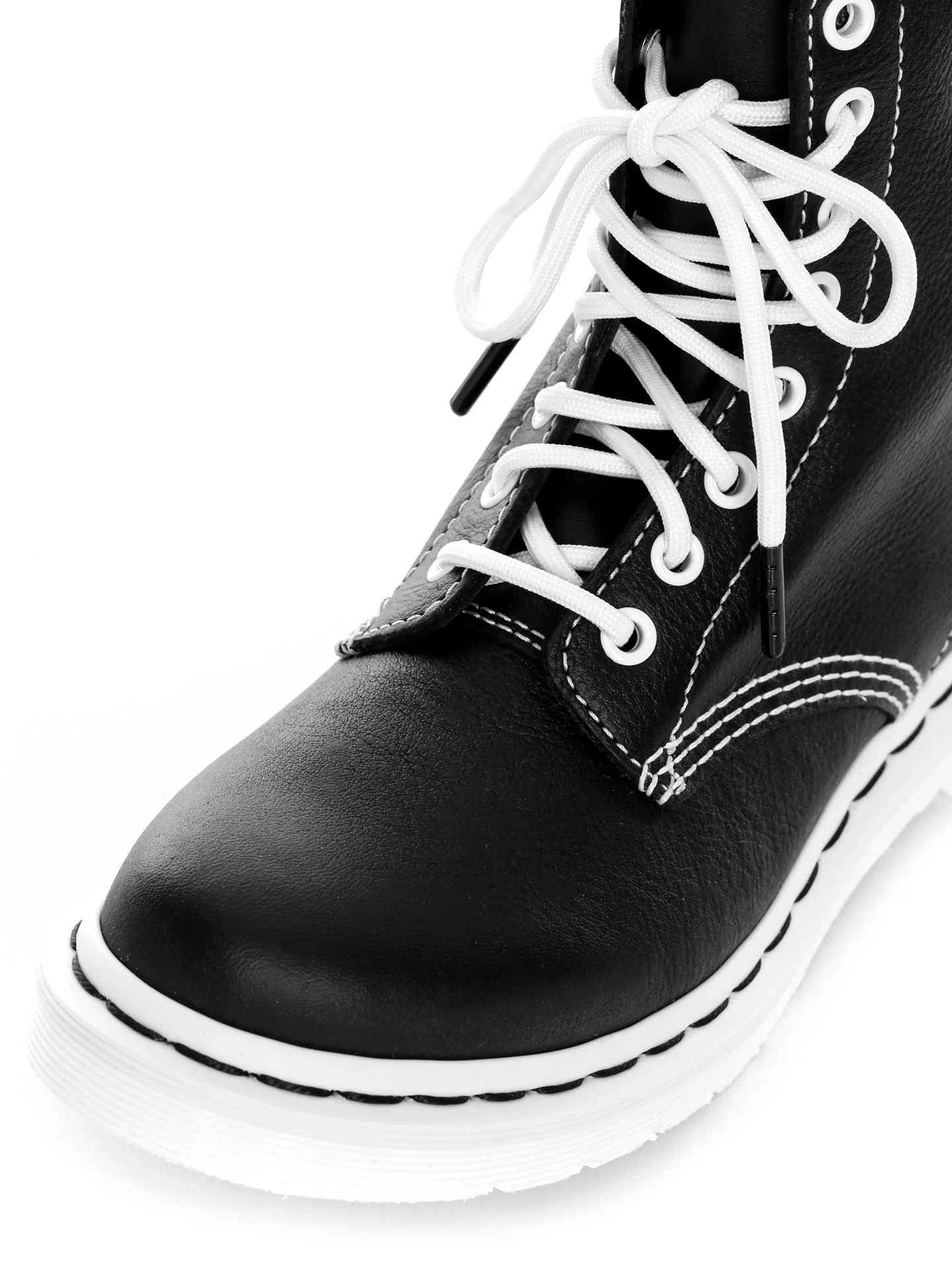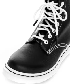 Obermaterial aus weichem schwarzem Leder,8-Loch Schnürung,Zugschlaufe an der Ferse,Mattes Obermaterial mit weißen Nähten,Breite Gummiaußensohle,Standard Fit,Kontrastierende schwarze Nähte an der weißen Sohle,Absatzhöhe: ca. 3 cm