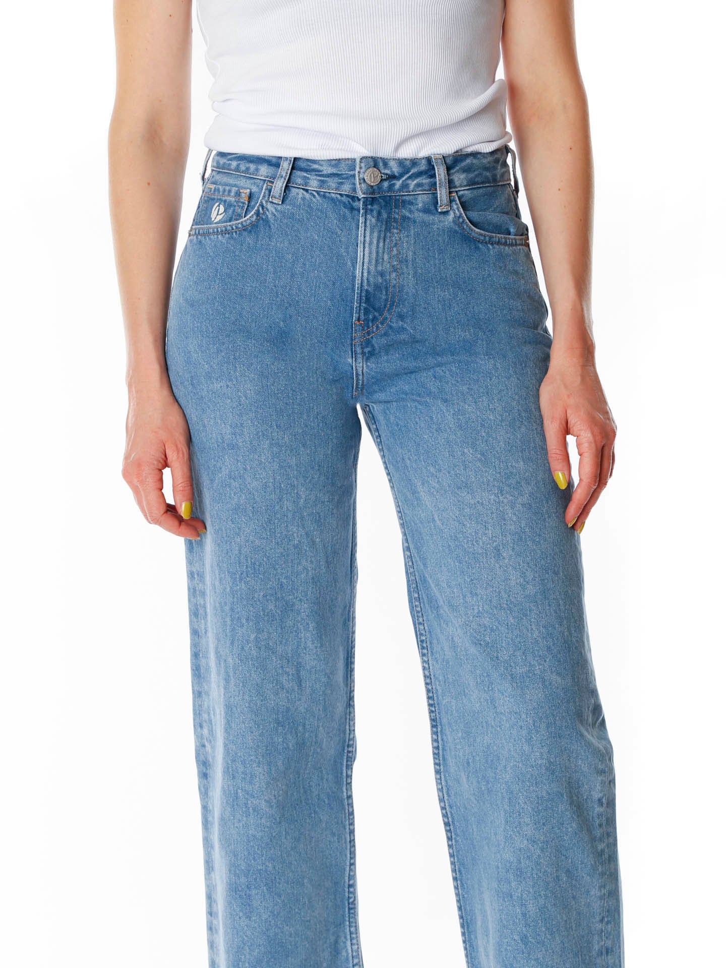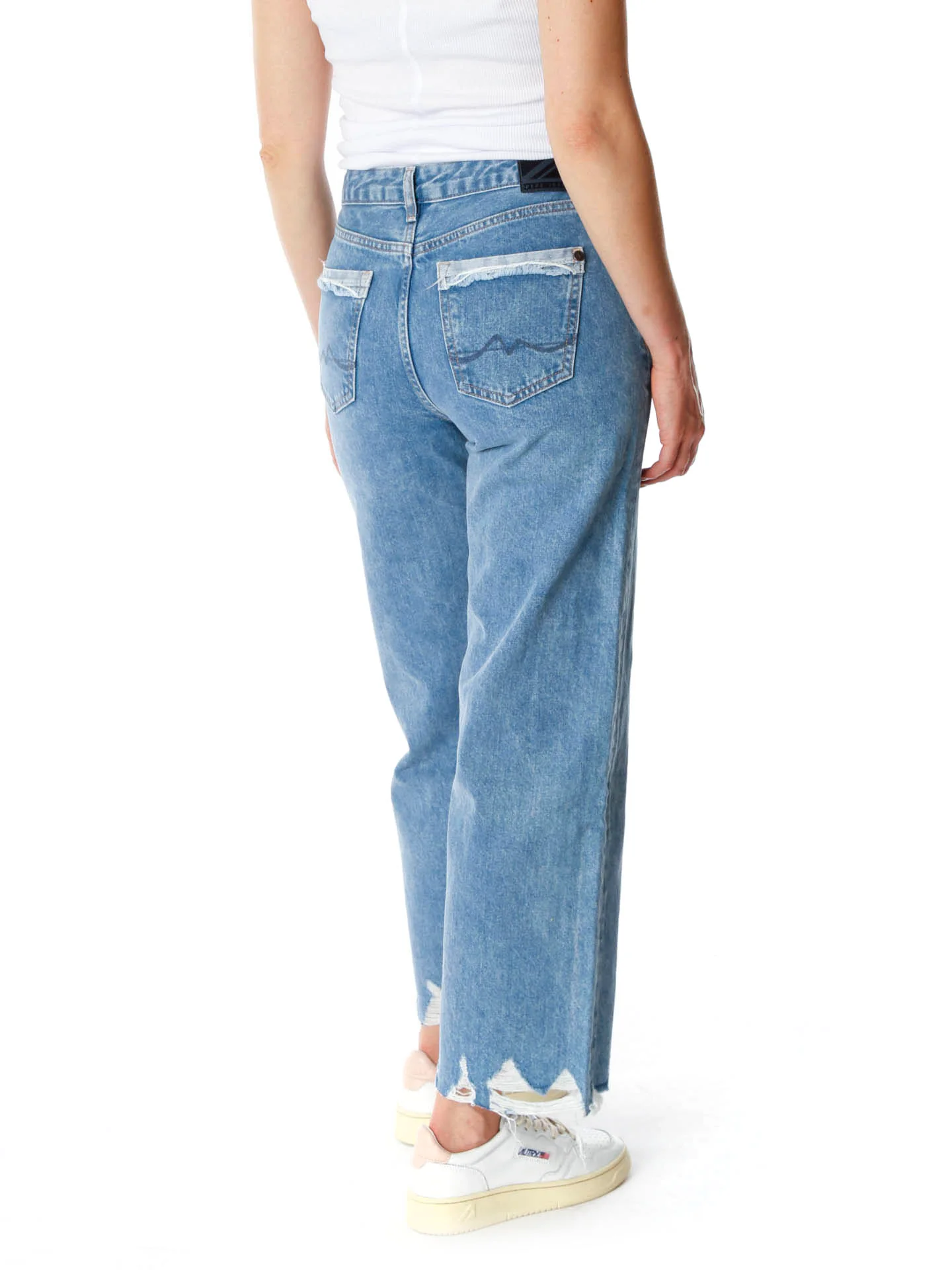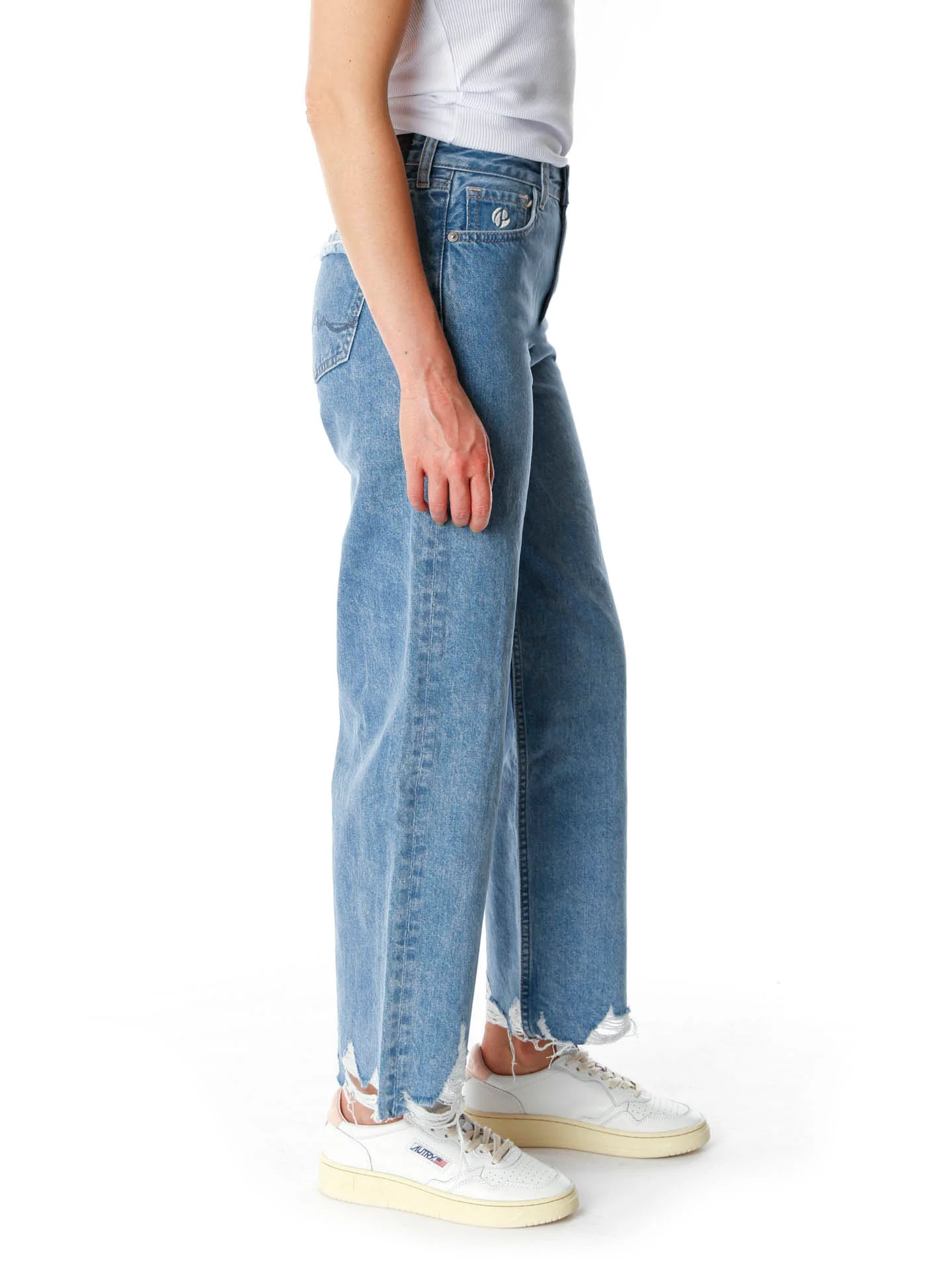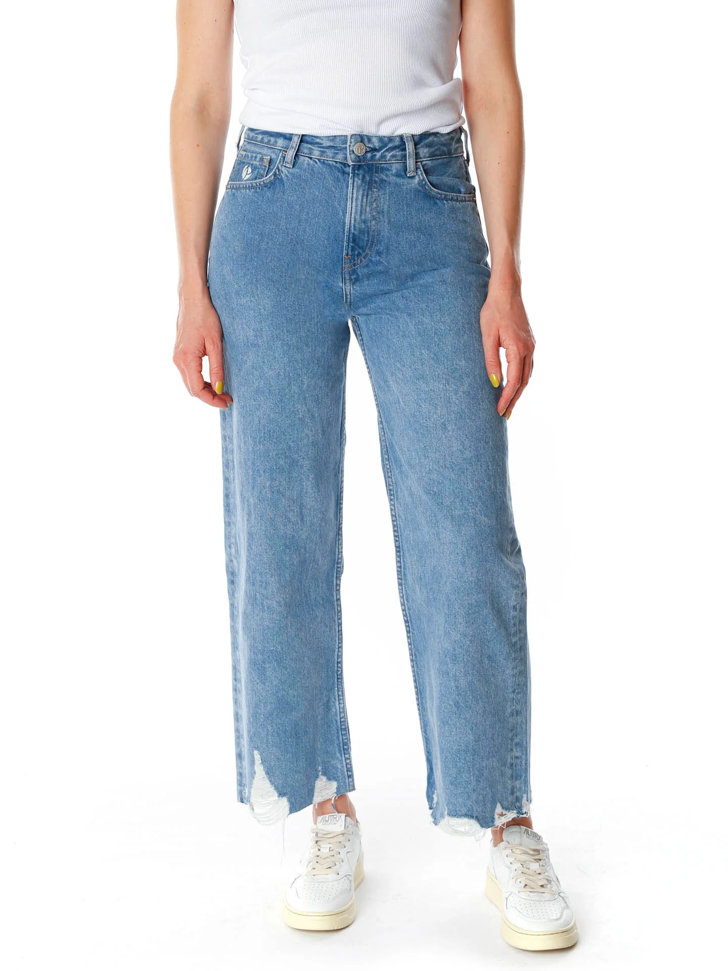 Lässige Jeans mit hoher Leibhöhe*Weit am Oberschenkel mit leicht schmal zulaufendem Beinverlauf*Mit Knopf und Reißverschluss zu verschließen*Offene ausgefranste Saumkante am unteren Beinabschluss*Destroyed-Detail am Umschlag an den Taschen auf der Rückseite*Mittelblauer Grundton relativ gleichmäßig ausgewaschen*Wird mit verkürzter Länge getragen*Unser Model trägt bei einer Größe von 1.73m die Gr. 26/28