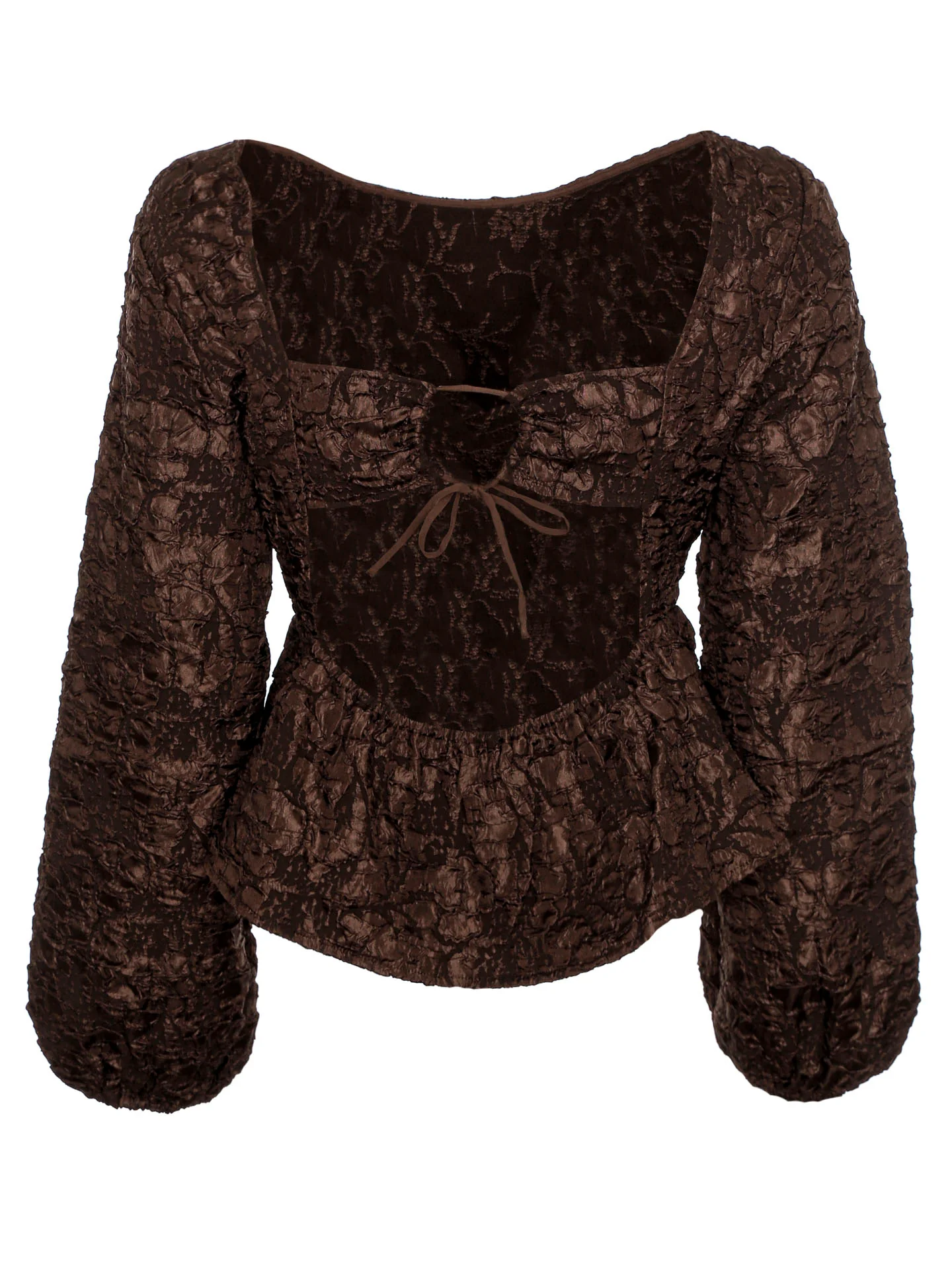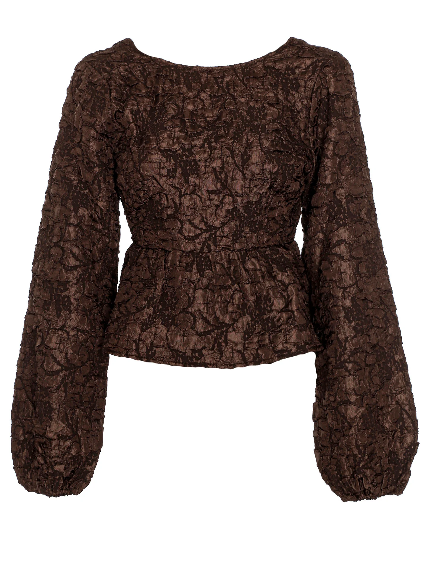 Blusentop mit großem Rundhalsausschnitt sowie Puffärmeln*Elastische Ärmelenden*Fühlbare 3D-Struktur allover*Offener Rücken (elastische Kante und Cut-Out-Detail mit Tunnelzug sowie Bindeband)*Figurbetonte Taille mit Gummizug*Enge Passform*Länge: hüftlang