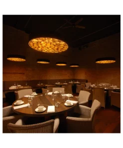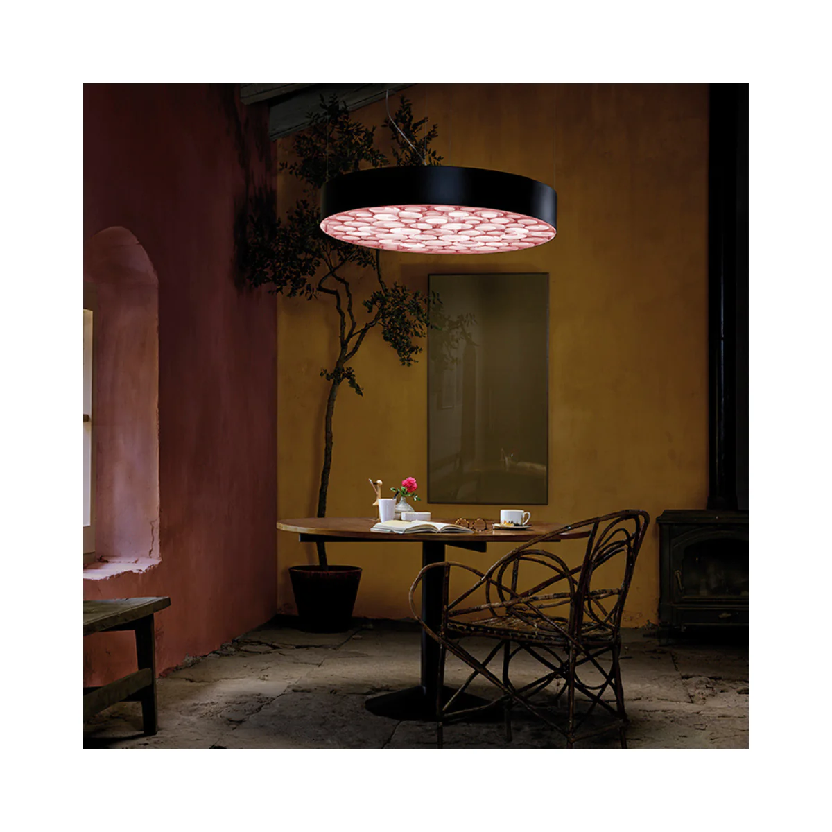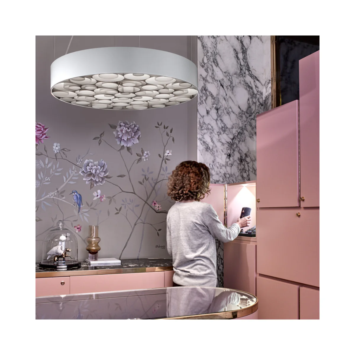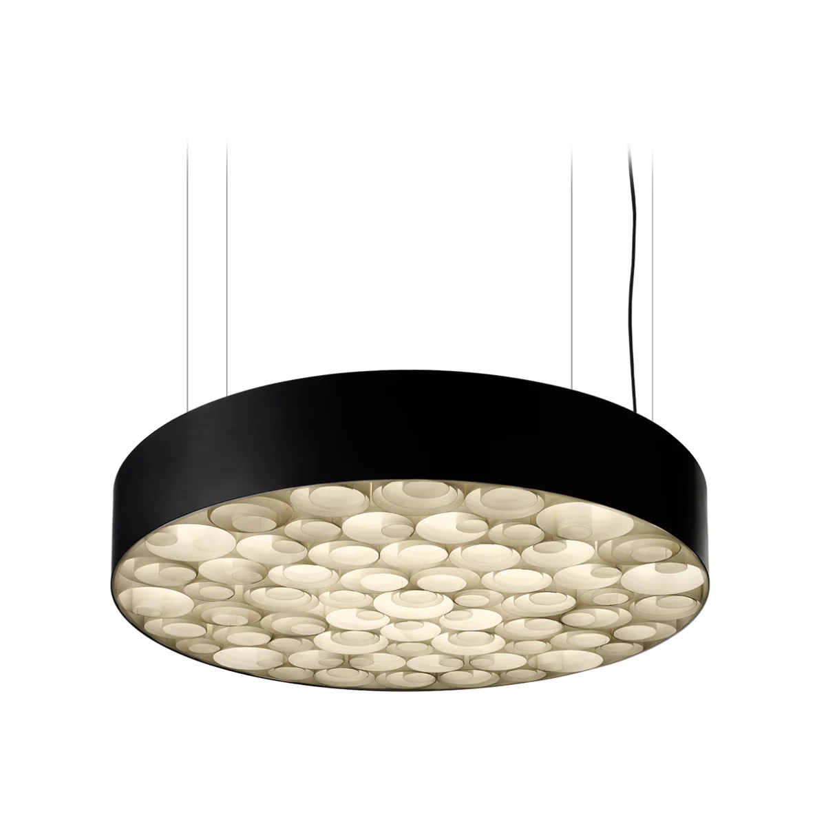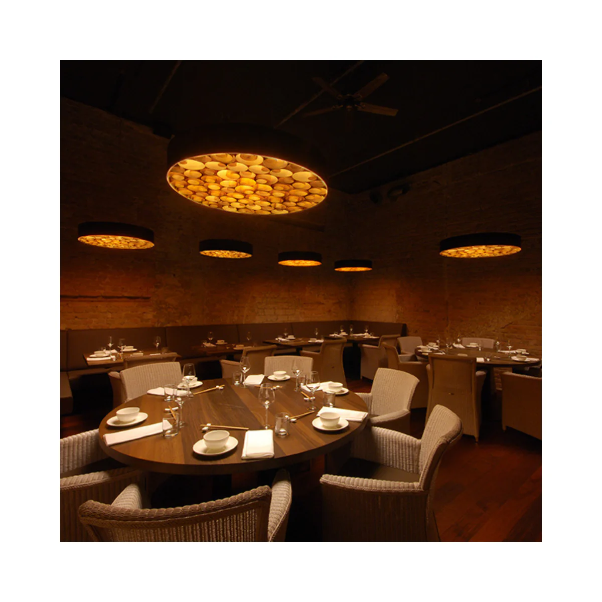 Die LEDs verstrahlen ihr warmweißes Licht vertikal durch matte Diffusorscheiben , und die nach unten gerichteten Ringe aus Holzfurnier sorgen für eine ganz individuelle Lichtstimmung.