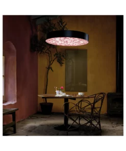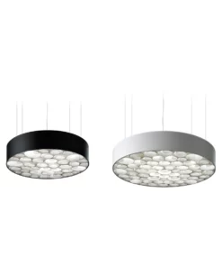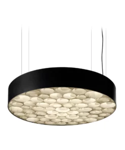 Unterschiedlich große, konzentrisch angeordnete Kreise aus Holzfurnier in patentierter LZF-Herstellung füllen den flachen zylindrischen Schirm mit umlaufendem Band aus schwarzem oder weißen Kunststoff.