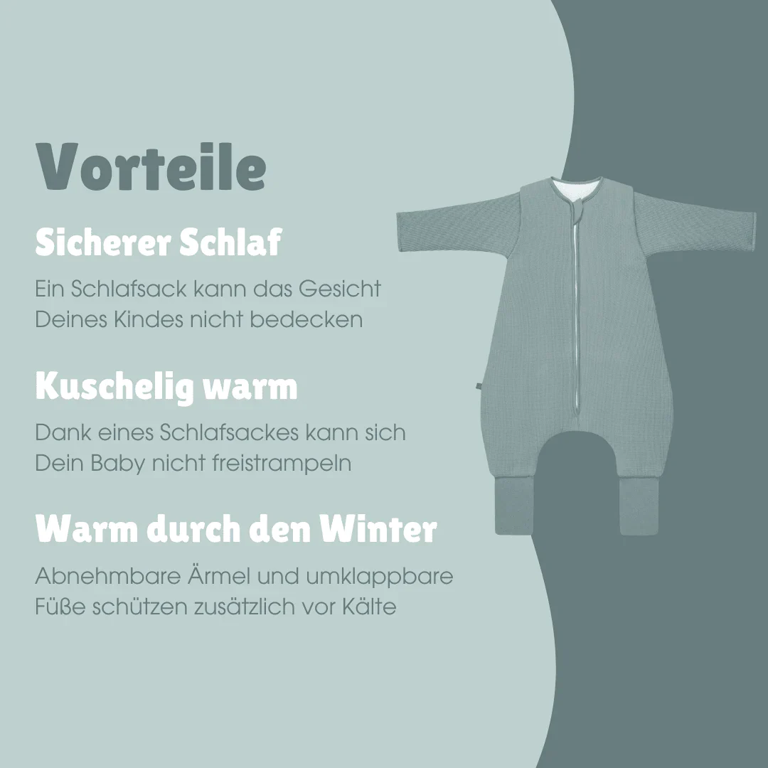 Ruhiger und sicherer Schlaf für Dein Baby. Ein Babyschlafsack von emma & noah bietet gegenüber einer Babydecke den Vorteil, dass das Gesicht des Kindes nicht bedeckt wird und es so jederzeit frei atmen kann. Der Schlafsack kann außerdem nicht durch Strampeln abgestreift werden und hält Dein Kind während des Schlafes sicher warm. Der Schlafsack ist besonders für aktive Kinder geeignet, da er durch die elastischen Jersey Füßchen viel Bewegungsfreiheit bietet.