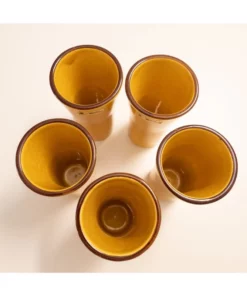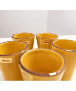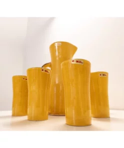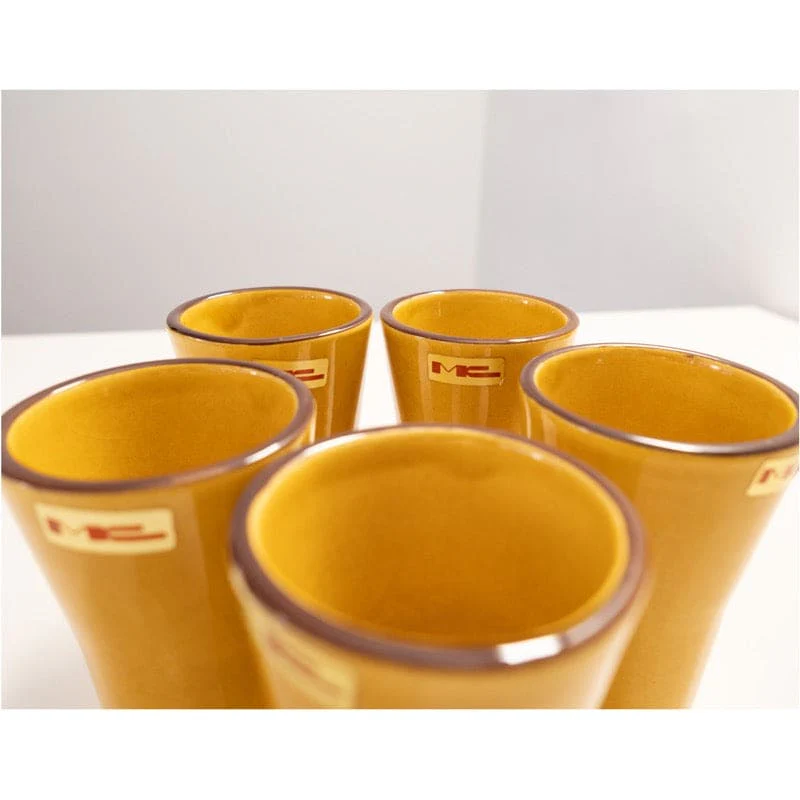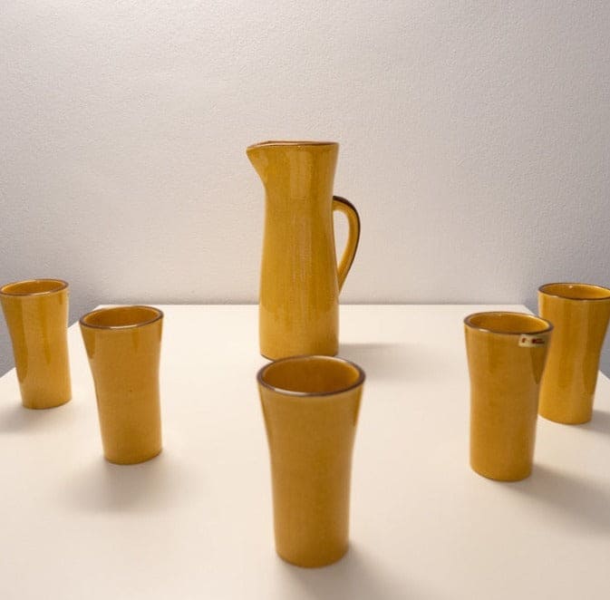 Frankreich, 1970er Jahre. Hübsches gelbes französisches Karaffenset mit 5 Bechern aus wunderschön glasierter Keramik, signiert mc, aus den 70er Jahren. Diese Art glasierter Keramik wird Fayence genannt, also zinnglasiertes und emailliertes Steingut, das erstmals im 16. Jahrhundert in Frankreich auftauchte. Es besteht aus einem Krug (Höhe 30 cm, Durchmesser 10 cm) und 5 Bechern (Höhe 14 cm, Durchmesser 7 cm). In sehr gutem Zustand mit Originaletikett. Eine leuchtend senfgelbe Farbe, hervorgehoben durch eine braune Linie mit einer schlanken Form. Zur Verwendung in der Küche oder als absoluter Hingucker in einem Regal. Herkunftsort: Frankreich. Herstellungsdatum: 1970er Jahre. Zeitraum: 1970-1979.