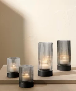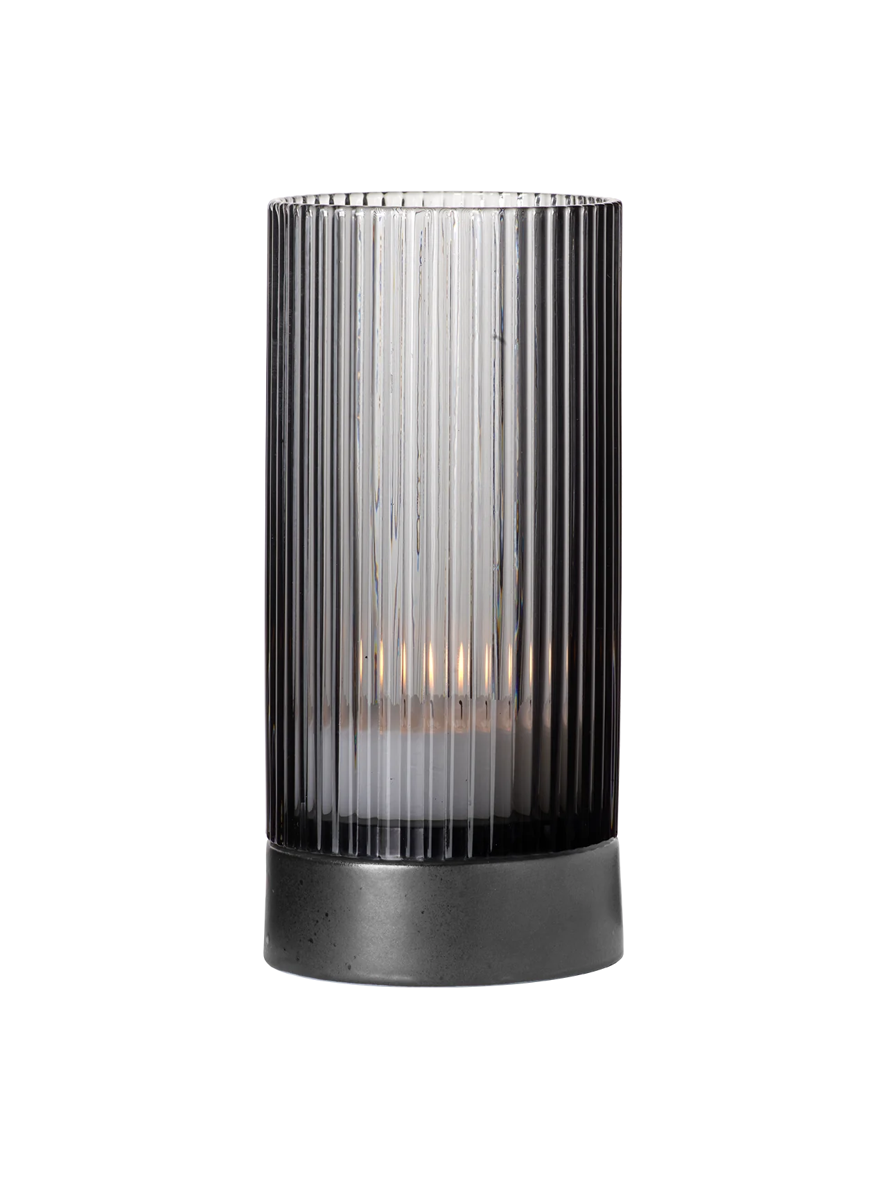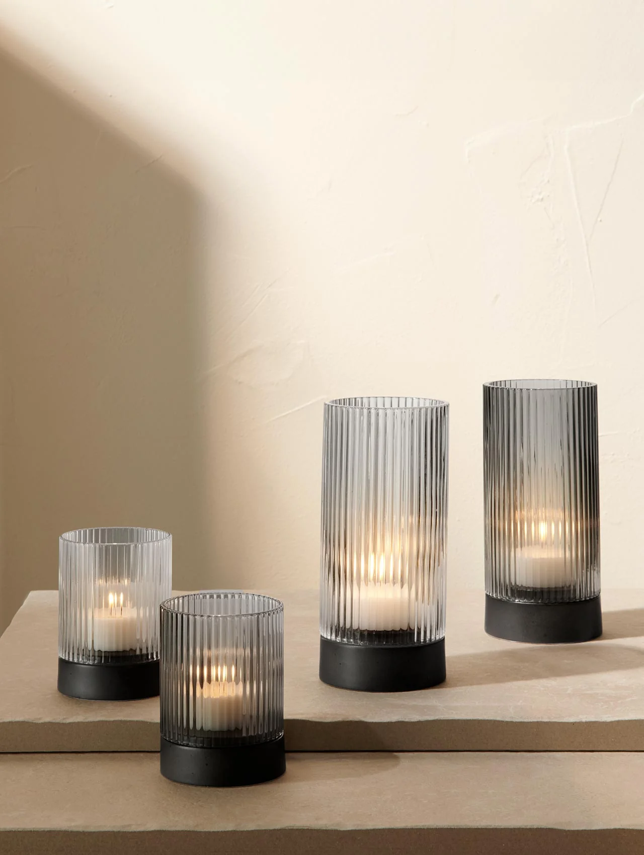 Windlicht aus leichtem Borosilikatglas mit Porzellanfuß. Das gerillte Oberflächendesign sorgt für funkelnde Lichtspiele. Ebenso überzeugen die funktionalen Details. So sorgt der edle Porzellanfuß dafür, dass selbst die Hitze einer ausbrennenden Kerze keinen Schaden auf dem Tisch anrichten kann.