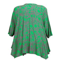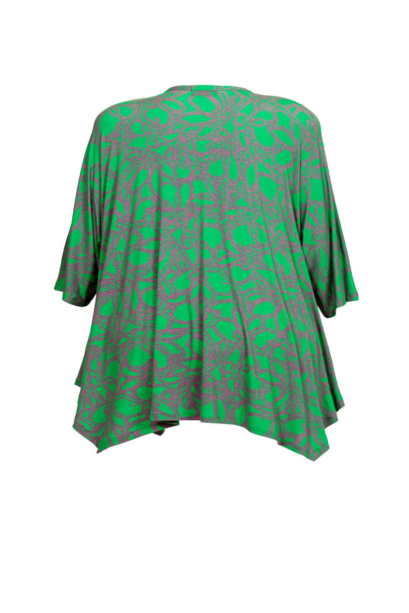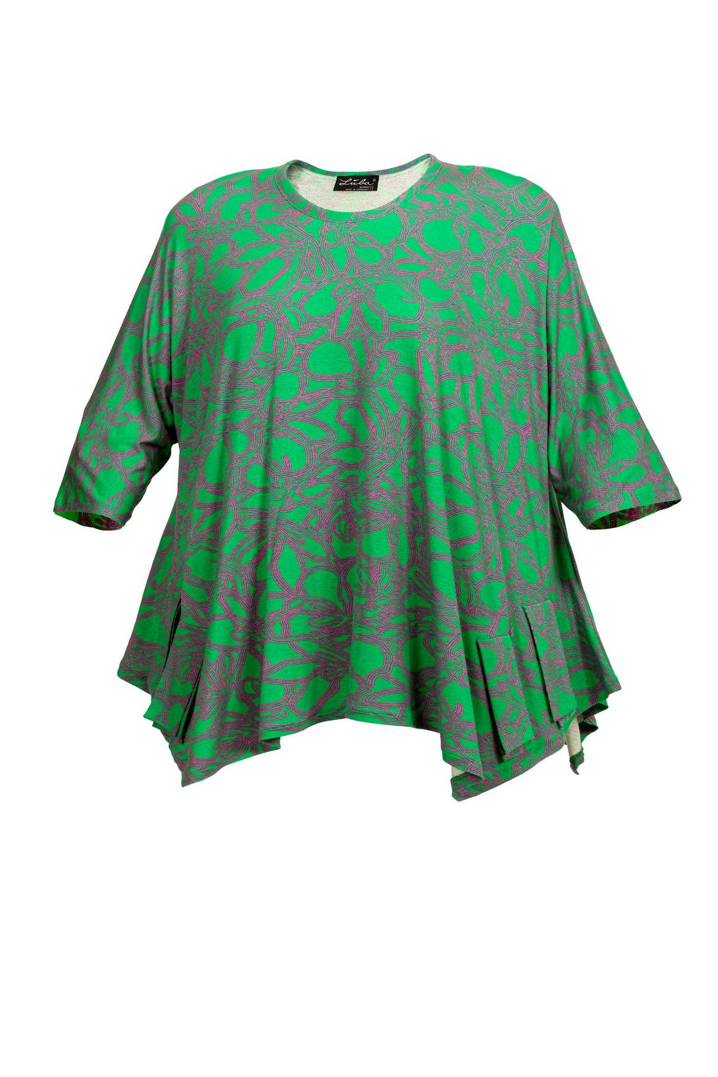 Bringen Sie Farbe in Ihre Garderobe mit unserer grün-pink gemusterten Jersey-Tunika, speziell entworfen für große Größen. Diese Tunika aus fließendem Viskose-Stoff bietet eine schmeichelhafte A-Linie mit einem klassischen Rundhalsausschnitt und einem modischen Zipfelsaum. Der lebendige Allover-Print verleiht dem Kleidungsstück einen frischen und dynamischen Look. Der raffinierte Schnitt kaschiert Problemzonen gekonnt und sorgt für wandelbare Looks, die Komfort und Stil vereinen.