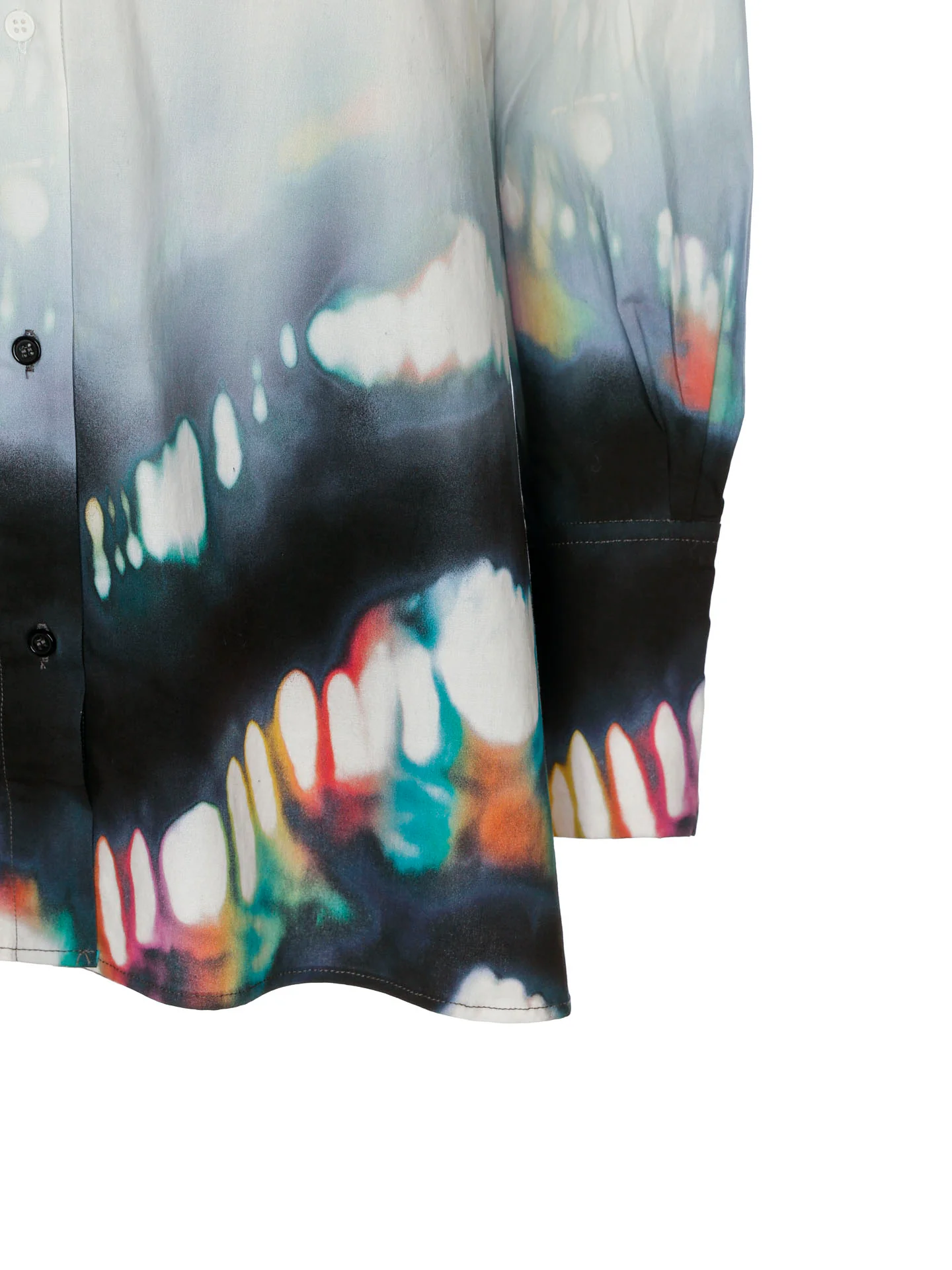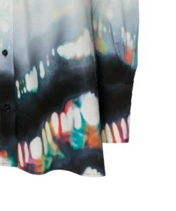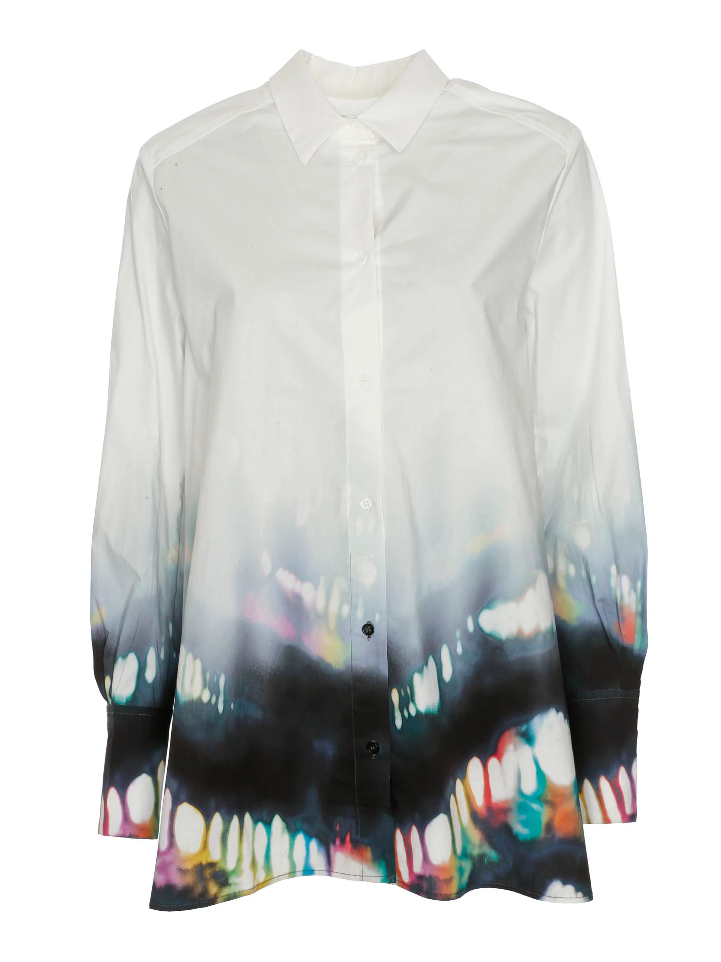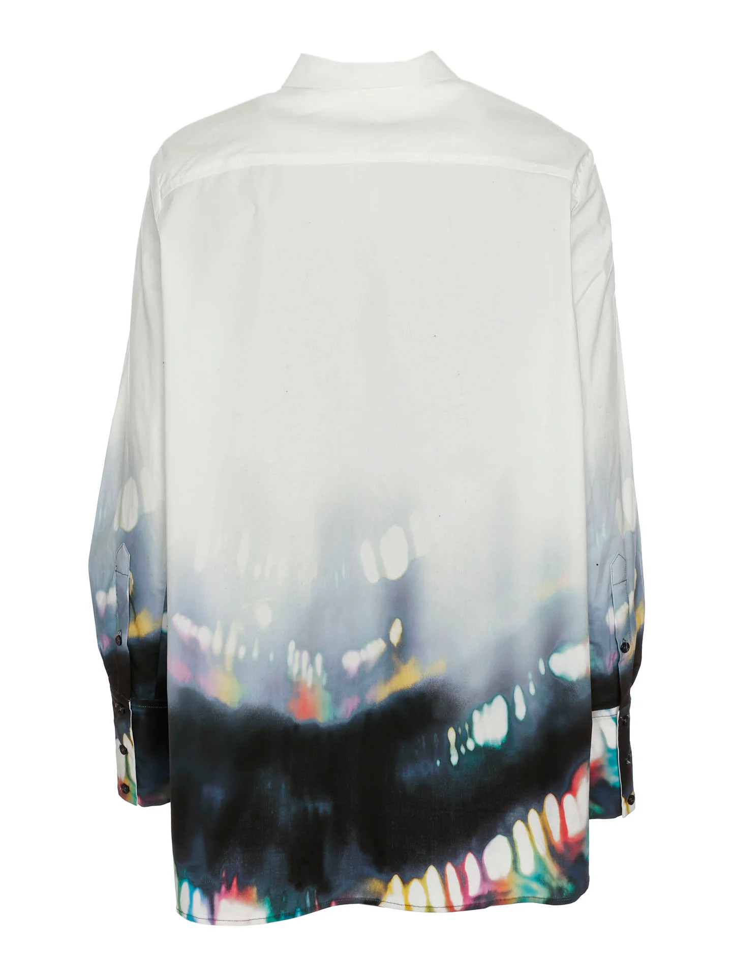 Hemdbluse mit klassichem Kragen*Durchgehende Knopfleiste*Leicht überschnittene Schulterpartie*Ärmelabschluss mit einer Vier-Knopf-Manschette zu verschließen*Verlängerte sowie abgerundete Rückenpartie*Breite Rückenpasse*Zwei Seitenschlitze*Leicht semitransparente Optik*Batik-Druck im unteren Bereich*Oversize-Fit*Länge: Oberschenkelansatz