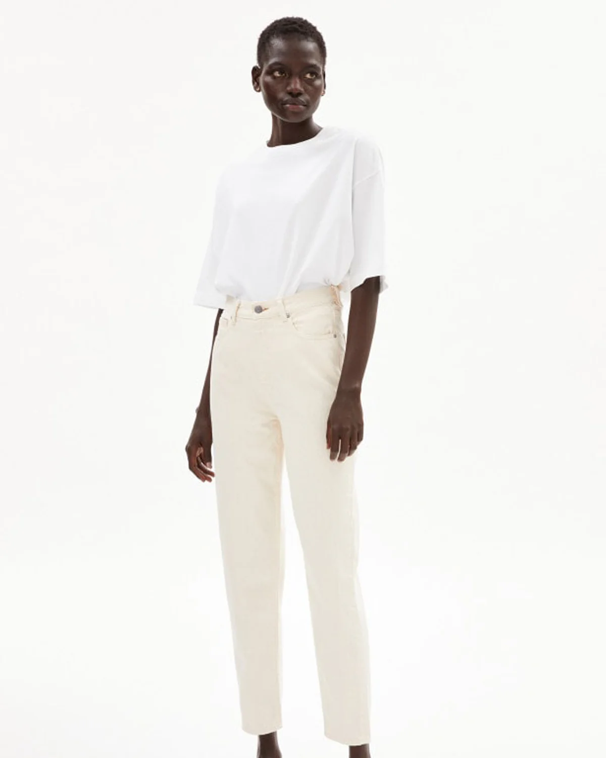 Für alle diejenigen, die sich in einer high waist mit schmalem Bein am lebendigsten fühlen. Der cropped Mom-Fit sagt „so 90er”. Die 100 % Bio-Baumwolle sagt: „aber ohne das unverantwortliche Konsumverhalten der 90er.”