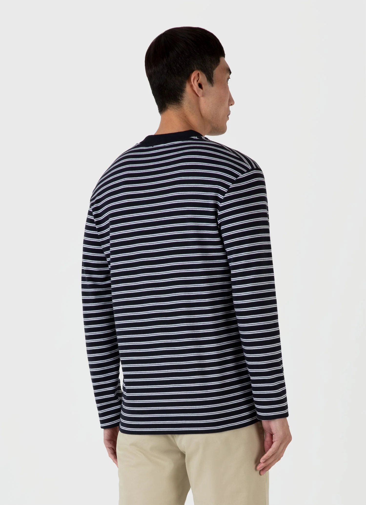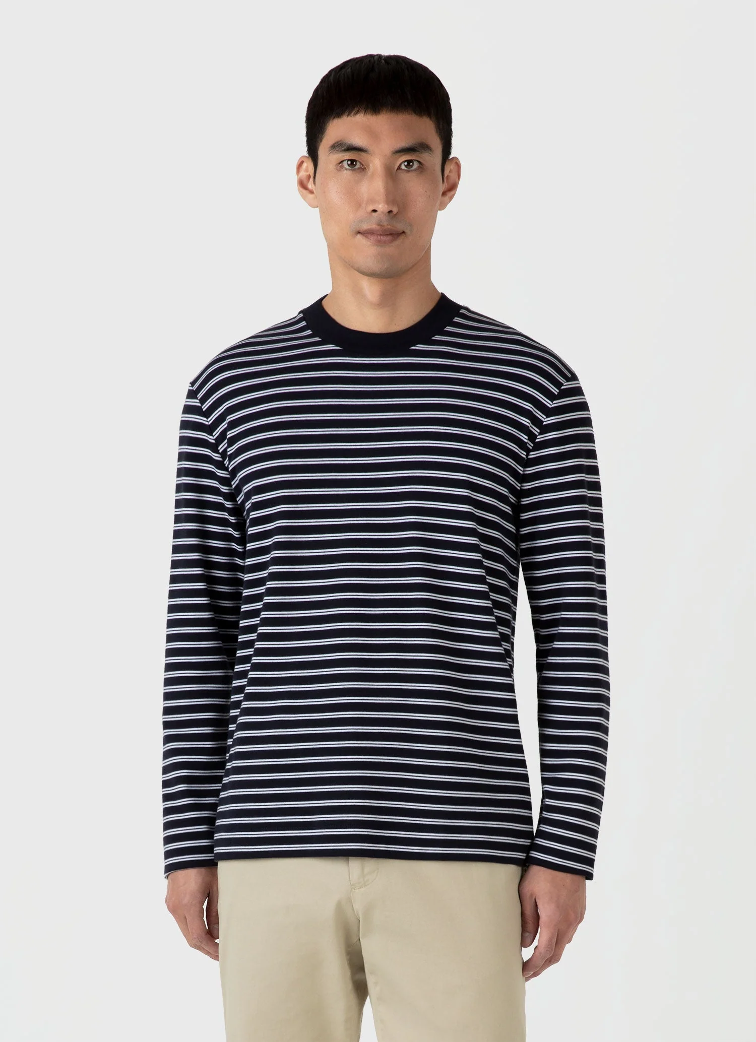 Dieses schwere T-Shirt ist aus hochwertiger kalifornischer, besonders langstapeliger Supima Baumwolle gefertigt, die für einen besonders weichen Griff mit Kohle gebürstet wurde. Es hat eine entspannte Passform, einen modernen, breiten Rundhalsausschnitt und eignet sich perfekt für einen Lagenlook. Tragen Sie es mit einer Jacke mit zwei Taschen oder unter einem Blazer für einen elegant modernen Look.