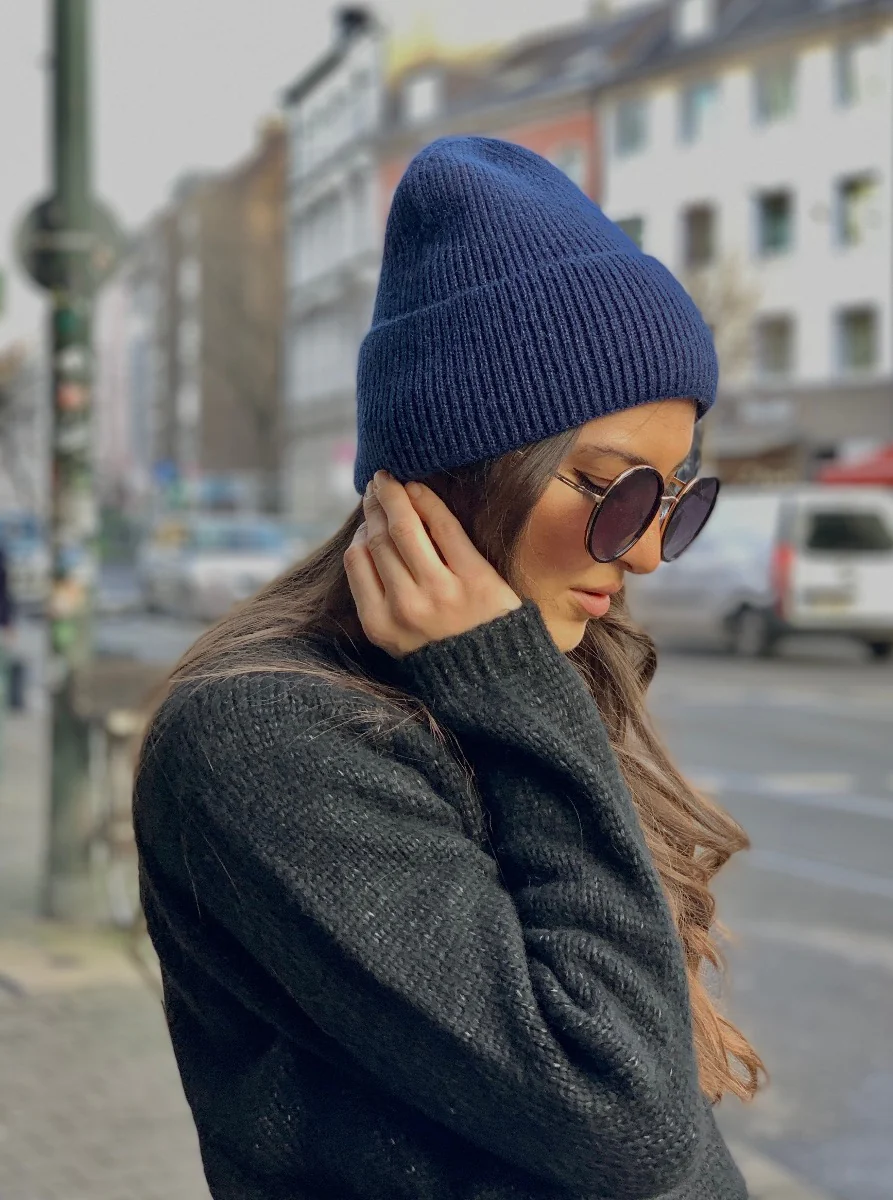 Klassische schlichte Beanie aus weichem Strick mit breitem Umschlag. Die Mütze ist sehr angenehm zu tragen, hält kuschelig warm und besteht aus einem Viskose-Mix. Sie ist unisex und onesize.