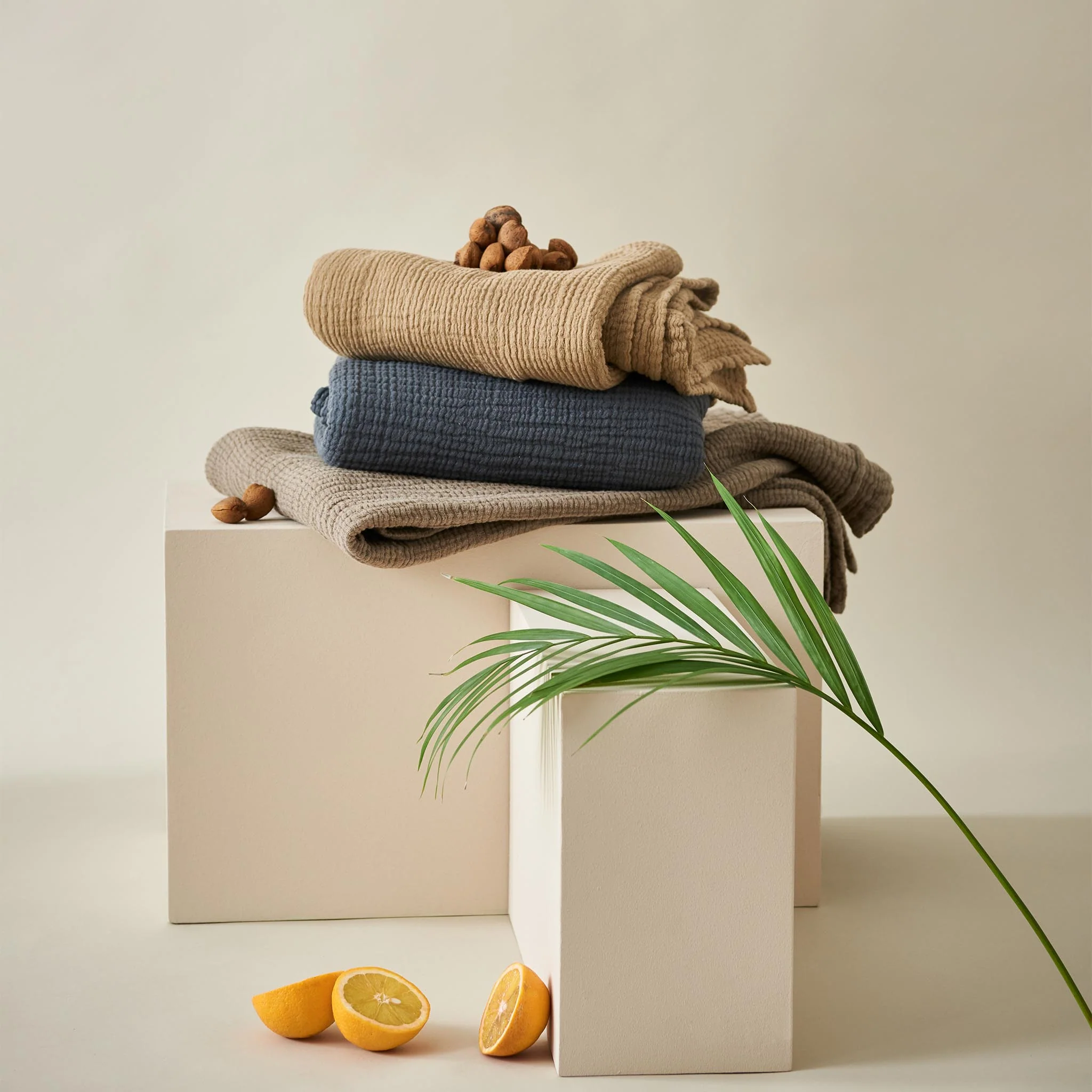 Unsere Musselindecke Sierra wird von unseren Partner:innen in Portugal aus Bio-Baumwolle gefertigt und mit einer innovativen, schonenden Färbetechnik, dem Earth-Colour-Prozess, gefärbt. Dabei werden Reste aus der Lebensmittelindustrie wie Orangenschalen, Mandelschalen und Rote Bete oder Palmen-Reste verwendet, die unserer Kollektion ihre einzigartigen Farben geben. So geben wir Ungenutztem einen neuen Sinn und tun unserer Umwelt etwas Gutes.