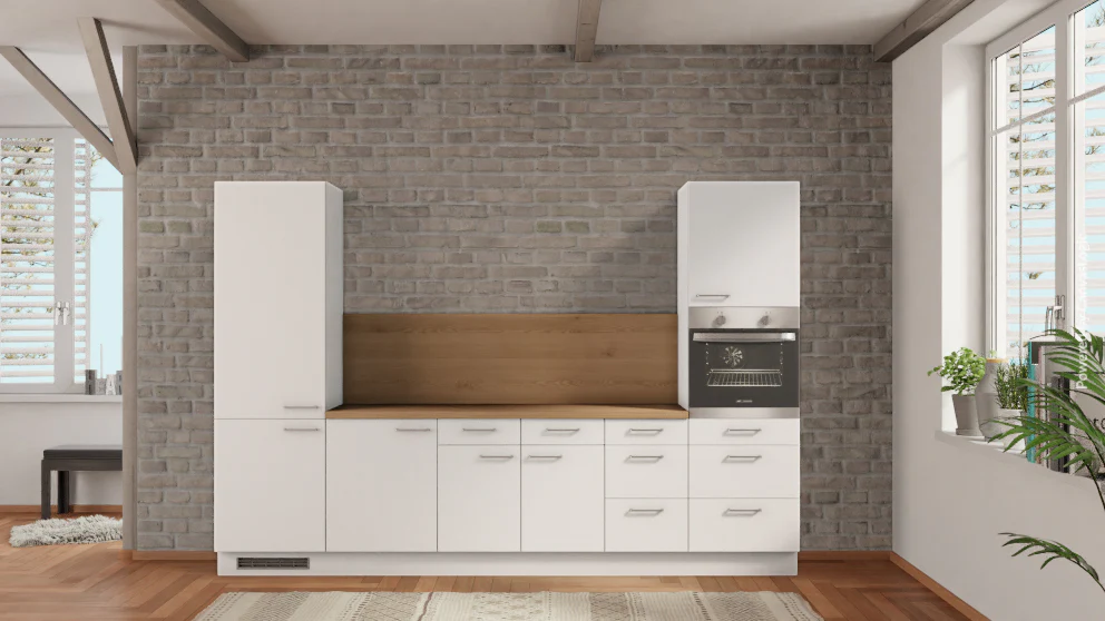 nobilia Küche Nordhorn 315 cm Alpinweiß matt günstige Küche Eiche Provence komplette Einbauküche |küche 315 cm breit | nobilia Küchenzeile in Weiß günstig aus dem nobilia Elements Sortiment | 2,15m hoch | Küche mit Kühlschrank | Küche mit Backofen | Küche onhe Geschirspüler