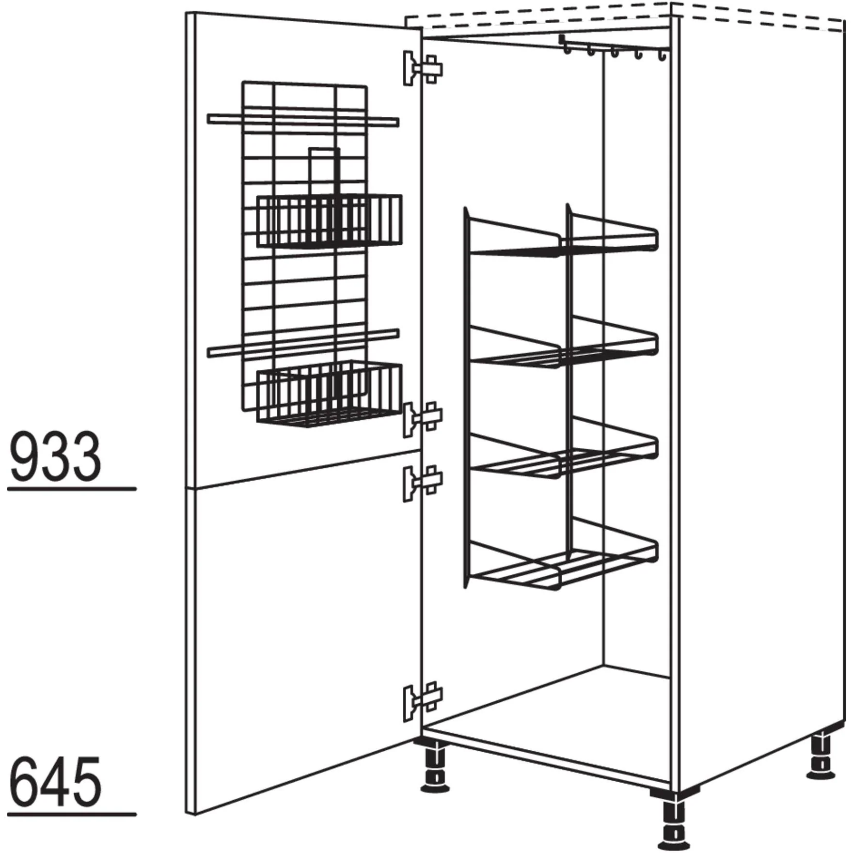 Im Inneren des Schranks finden Sie 1 Systemgitter, 2 Putzmittelkörbe, 1 Systemregal, 1 Schlauchhalter für den Staubsauger und 2 Hakenleisten. Diese durchdachten Details sorgen dafür, dass all Ihre Reinigungsutensilien ordentlich verstaut werden können und jederzeit griffbereit sind.