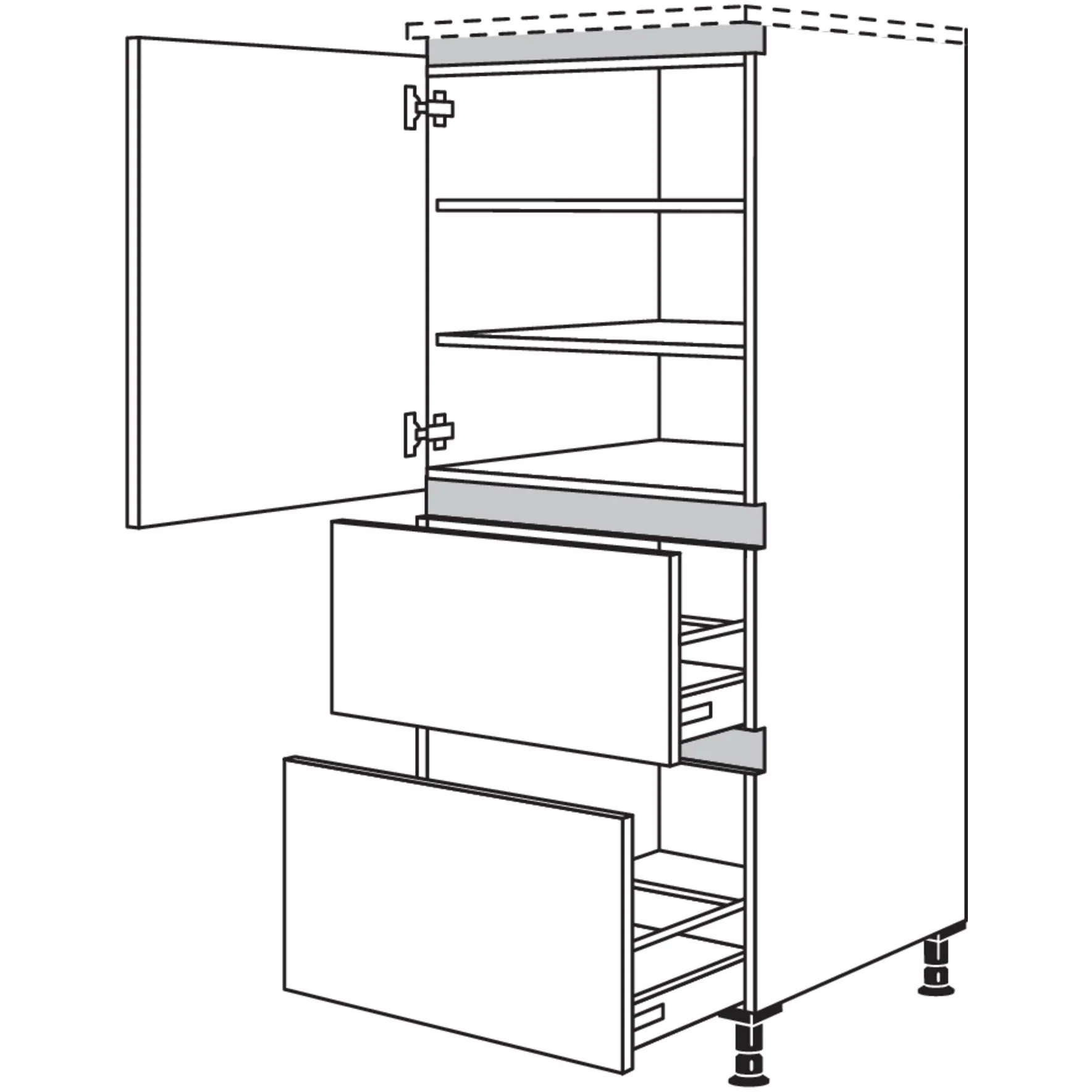 Das nobilia XL-Highboard verfügt über 1 Tür mit Automatik-Topfscharnieren und Türdämpfer mit Soft-Close-Funktion, 2 Einlegeböden, sowie 2 Auszüge mit hochwertigen Vollauszügen und Ein- und Auszugsdämpfung Silent System / Soft-Close. Der Schrank ist mit einem Auszug und Licht ausgestattet, was sowohl Funktionalität als auch Ästhetik in Ihrer Küche verbessert.