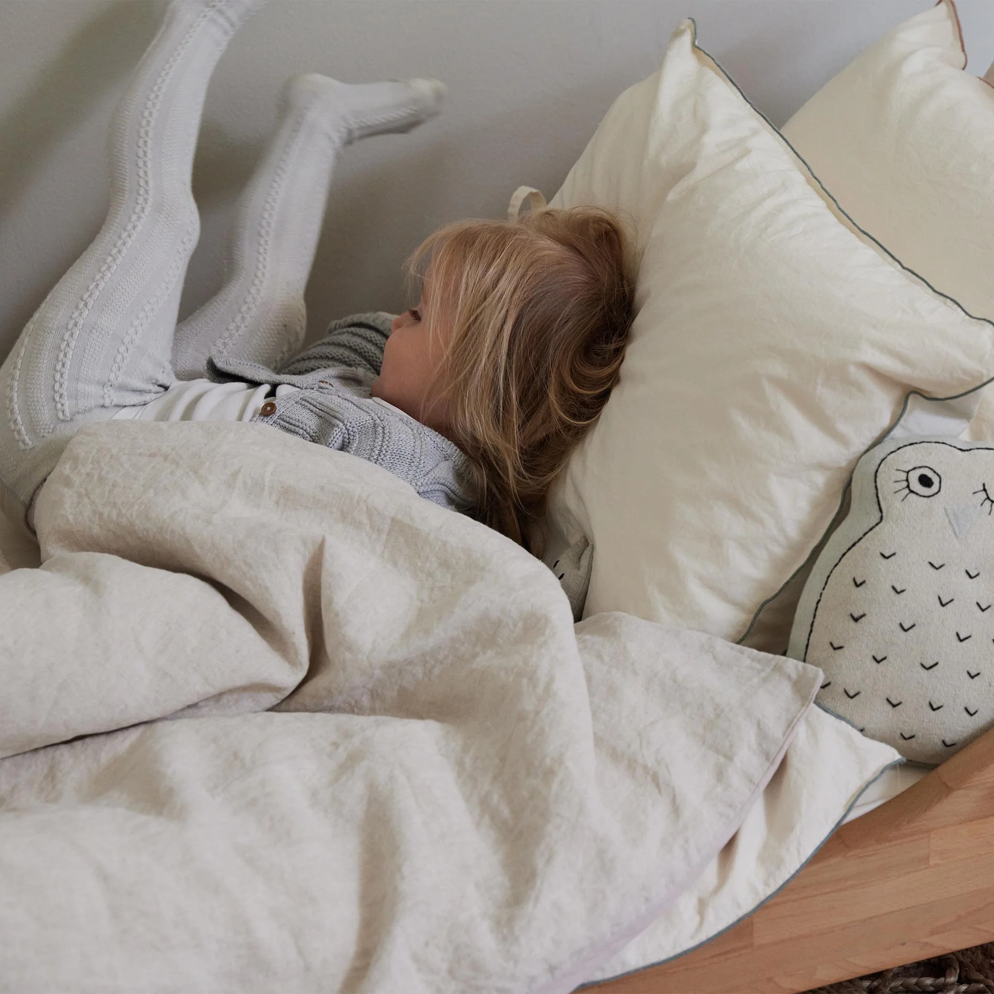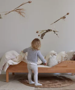 Seit Längerem wollten wir eine entzückende Mini-Version unserer Kollektion Navaro kreieren. Der Grund? Weniger Chemikalien, denen die Kleinen so ausgesetzt sind. Wie in der Familie üblich ist auch unsere Kinderbettwäsche Narini ungefärbt. Reinste Baumwolle wird von unseren erfahrenen Partnern zu atmungsaktivem, saugfähigem und kuschelig weichem Perkal verwebt. Besonders schön: der natürliche, sanfte Offwhite-Farbton. Neben einer farblich abgesetzten Naht aus recycelter Baumwolle gilt Nachhaltigkeit hier auch für die Verpackung. Denn: Die Baumwolltasche können Sie wiederverwenden. Charmante Schlaufen an Kopfkissen- und Bettdeckenbezug setzen zudem einen verspielten Akzent.