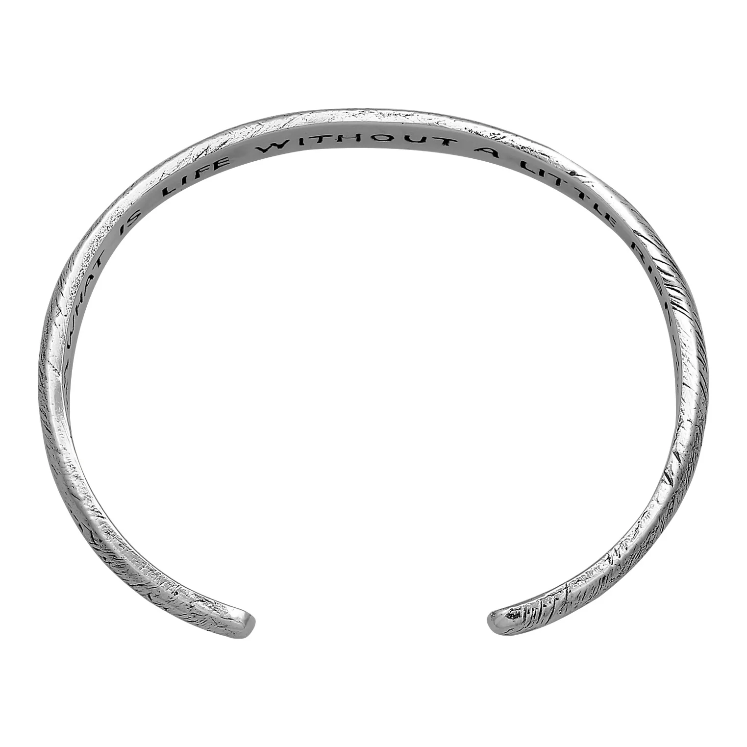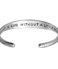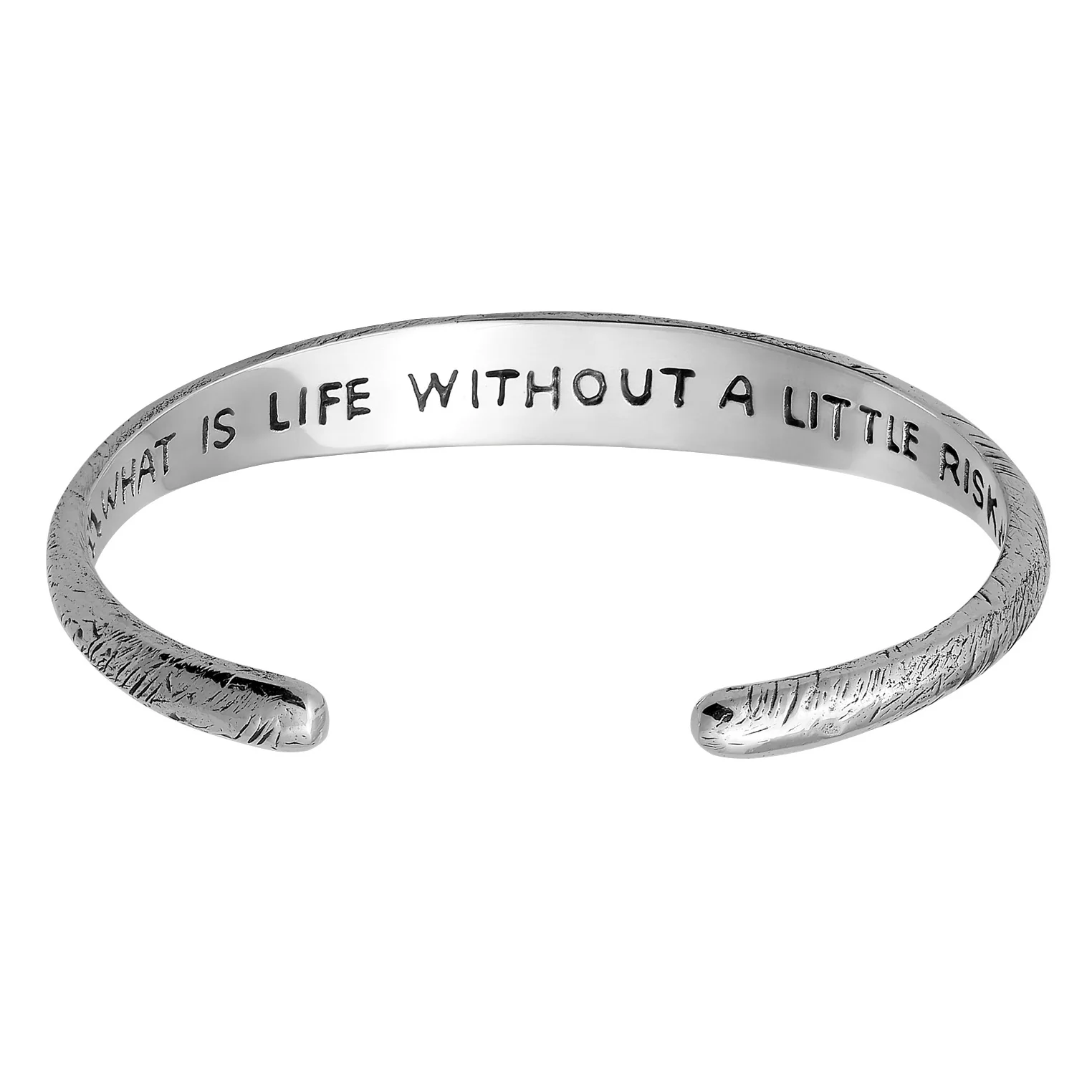 Der Risk Armreif ist ein solider Silber Armreif, den wir stark gekratzt und oxidiert haben. Die Worte „What Is Life Without A Little Risk“ verzieren die Innenseite des Armreifs. Der Armreif kann durch leichtes Zusammendrücken an die Handgelenksgrösse angepasst werden.