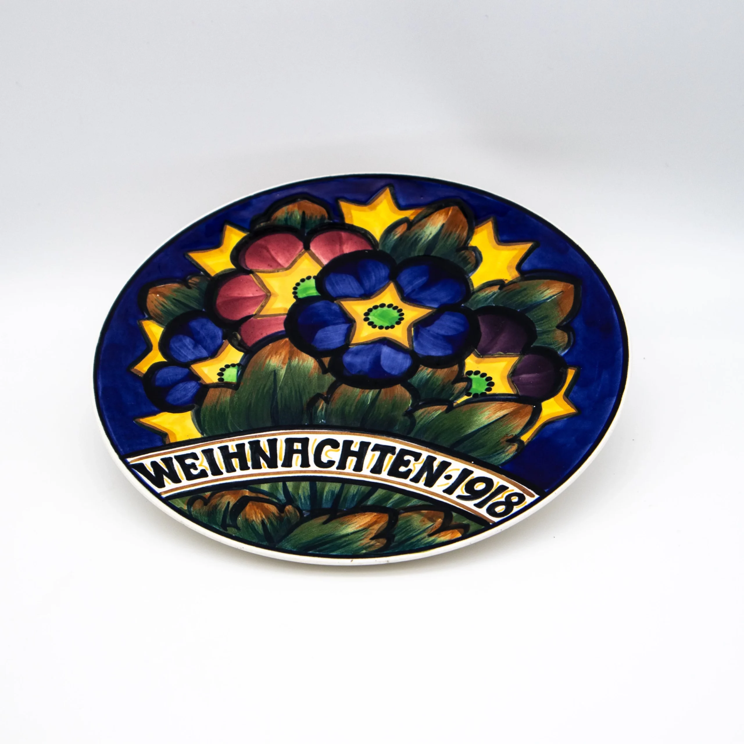 Der besondere Wandteller mit der Inschrift “Weihnachten 1918” wurde von Hans Christian Joachim 1918 für die Fayence Fabrik Aluminia / Royal Copenhagen in Dänemark entworfen. Auf seiner Rückseite ist der Wortlaut “Alemania” eingestempelt. Sie war also für den Export nach Deutschland bestimmt.