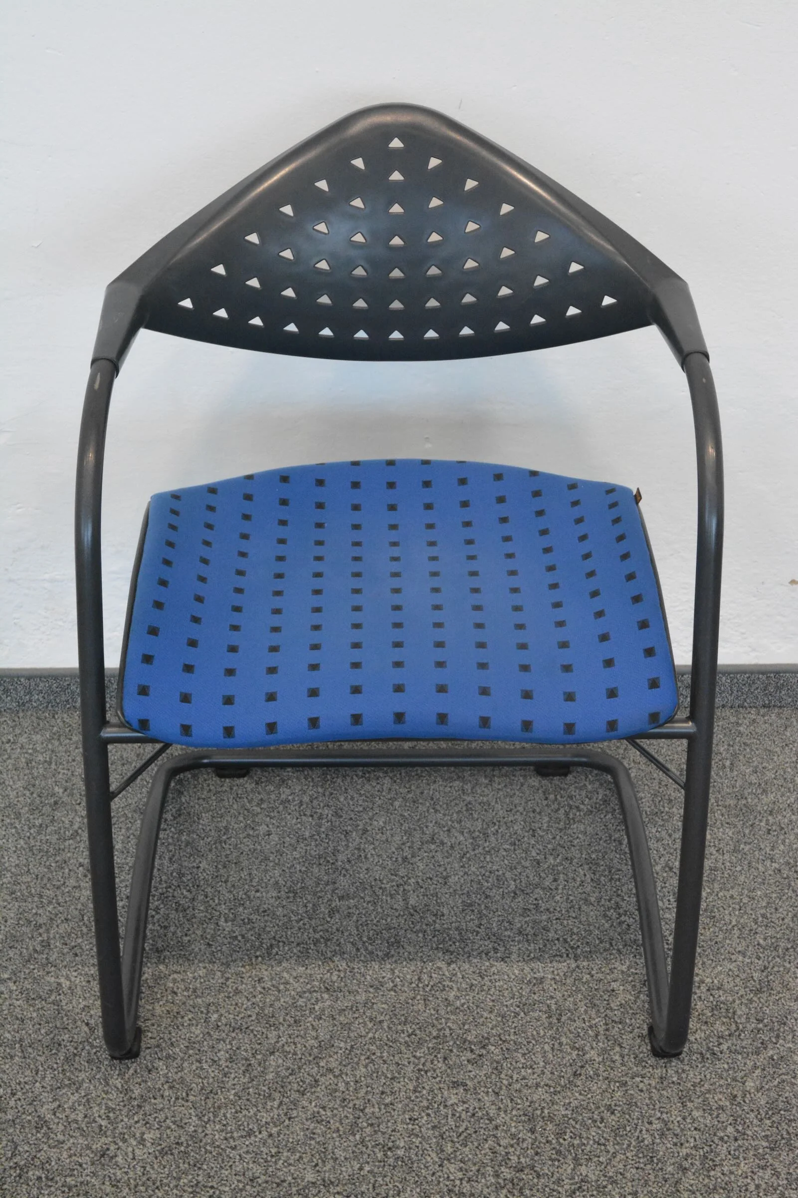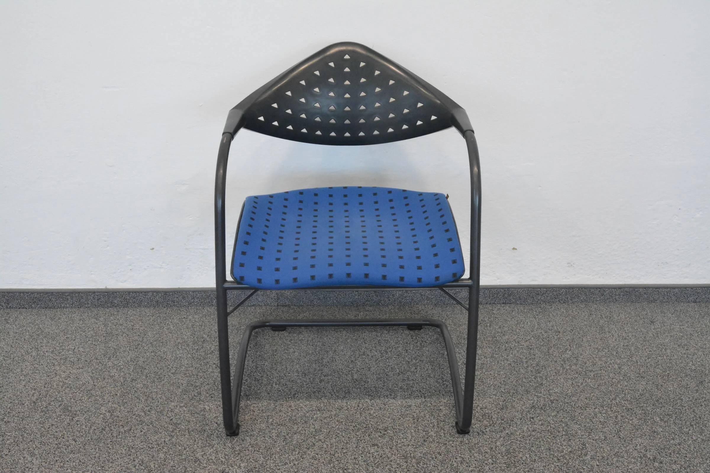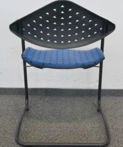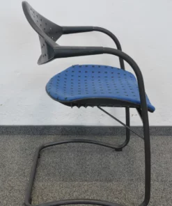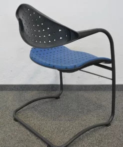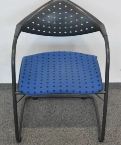 Der hochwertige Stoffbezug in Blau/Schwarz gemustert verleiht dem Stuhl eine ansprechende Optik, die ideal für Besprechungsräume, Konferenzen oder Wartezonen geeignet ist. Die stabile Konstruktion garantiert Langlebigkeit und eignet sich hervorragend für den täglichen Einsatz.