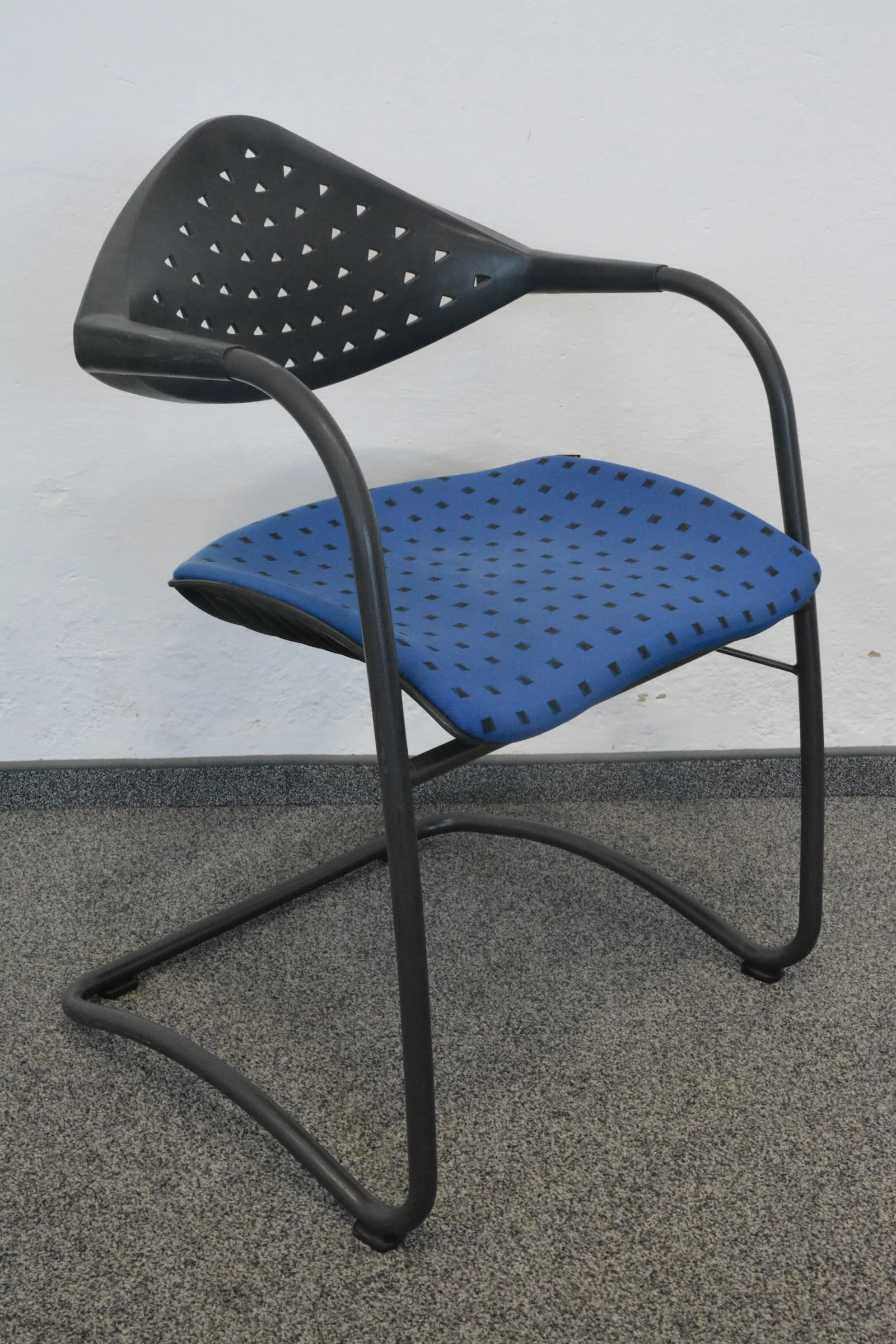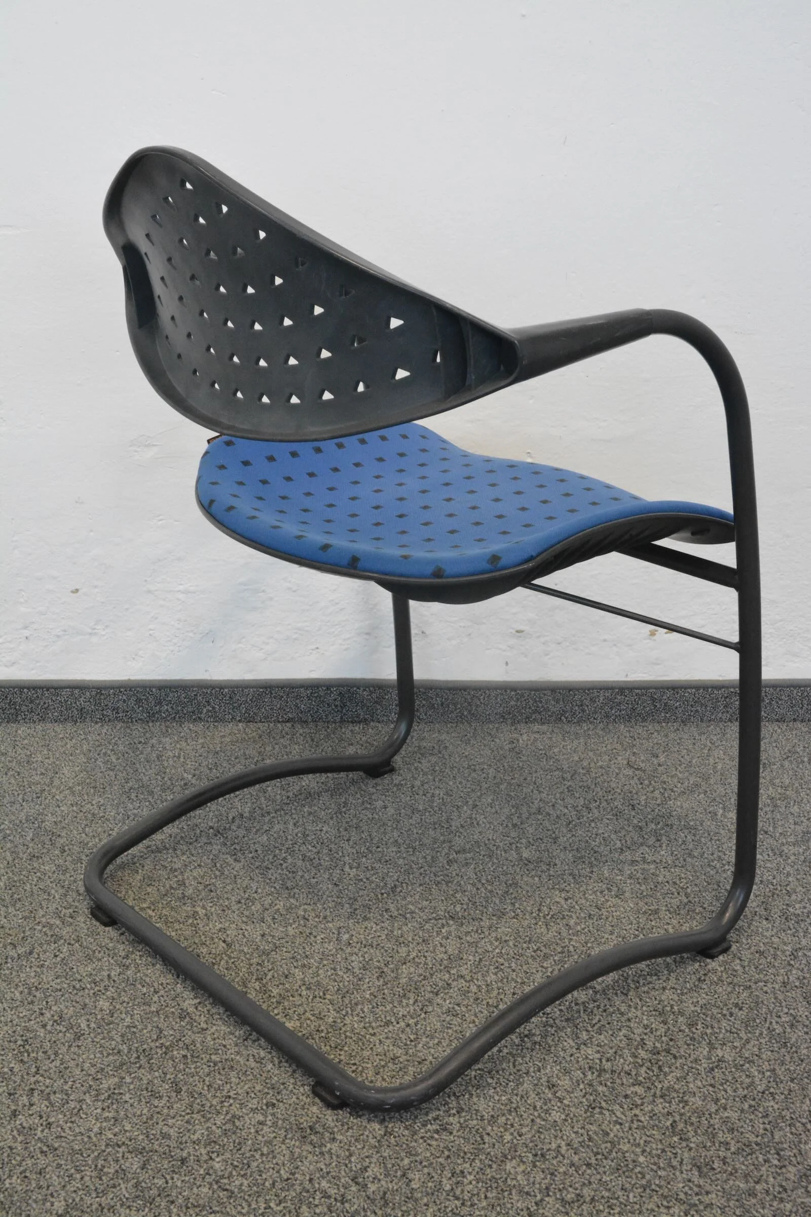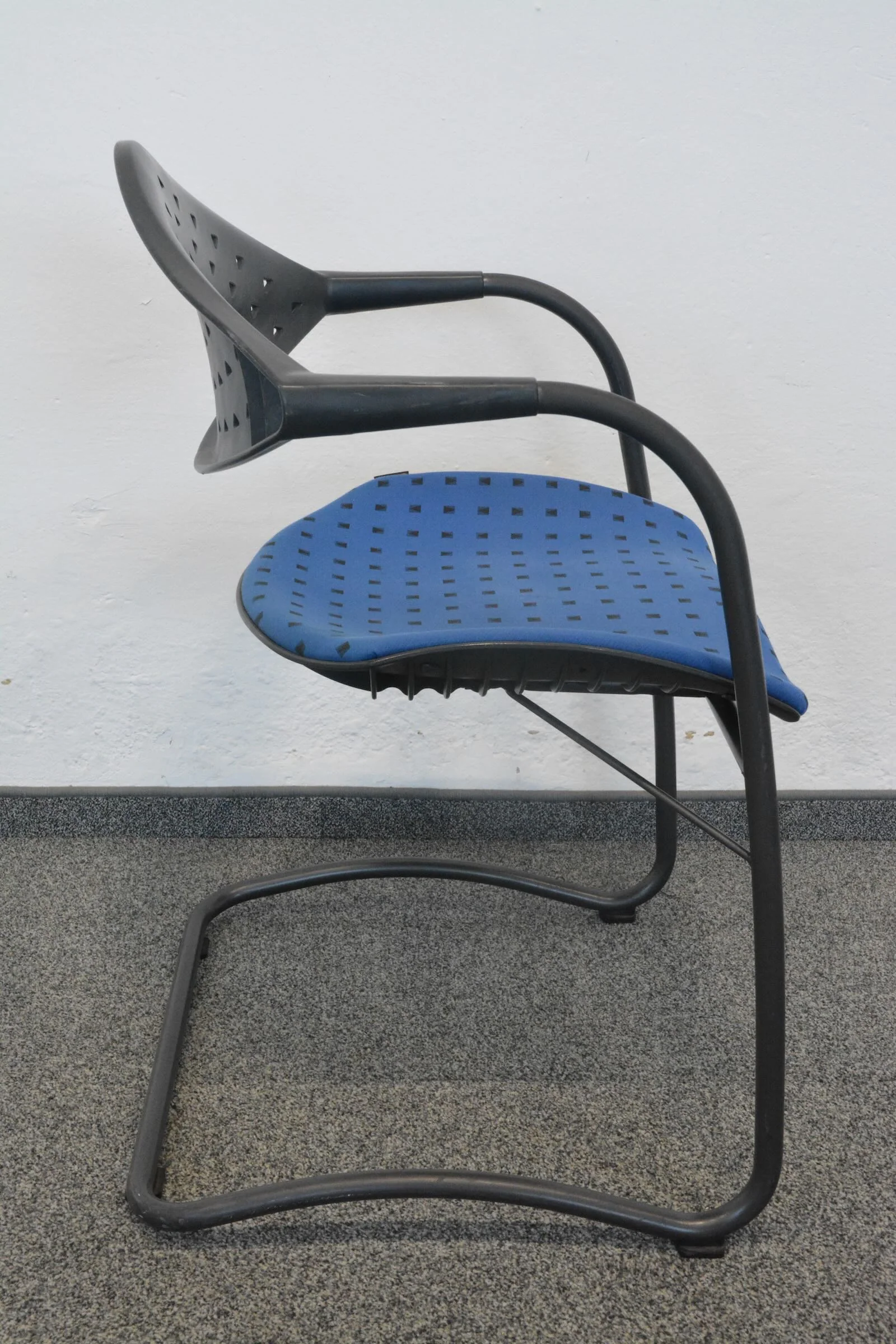 Der hochwertige Stoffbezug in Blau/Schwarz gemustert verleiht dem Stuhl eine ansprechende Optik, die ideal für Besprechungsräume, Konferenzen oder Wartezonen geeignet ist. Die stabile Konstruktion garantiert Langlebigkeit und eignet sich hervorragend für den täglichen Einsatz.