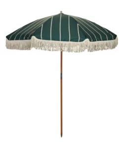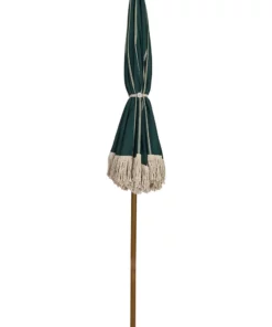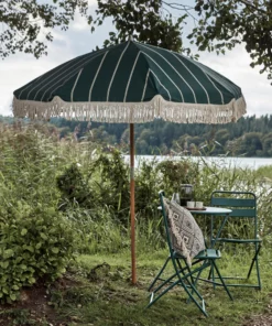 Mit seinem ansprechenden Design, das beigefarbene Streifen auf einem tiefgrünen Hintergrund kombiniert, bringt dieser Sonnenschirm einen Hauch von Vintage-Charme in deinen Garten oder auf deine Terrasse. Die langen, dicken Fransen verleihen dem Schirm eine verspielte Note und machen ihn zu einem echten Blickfang.