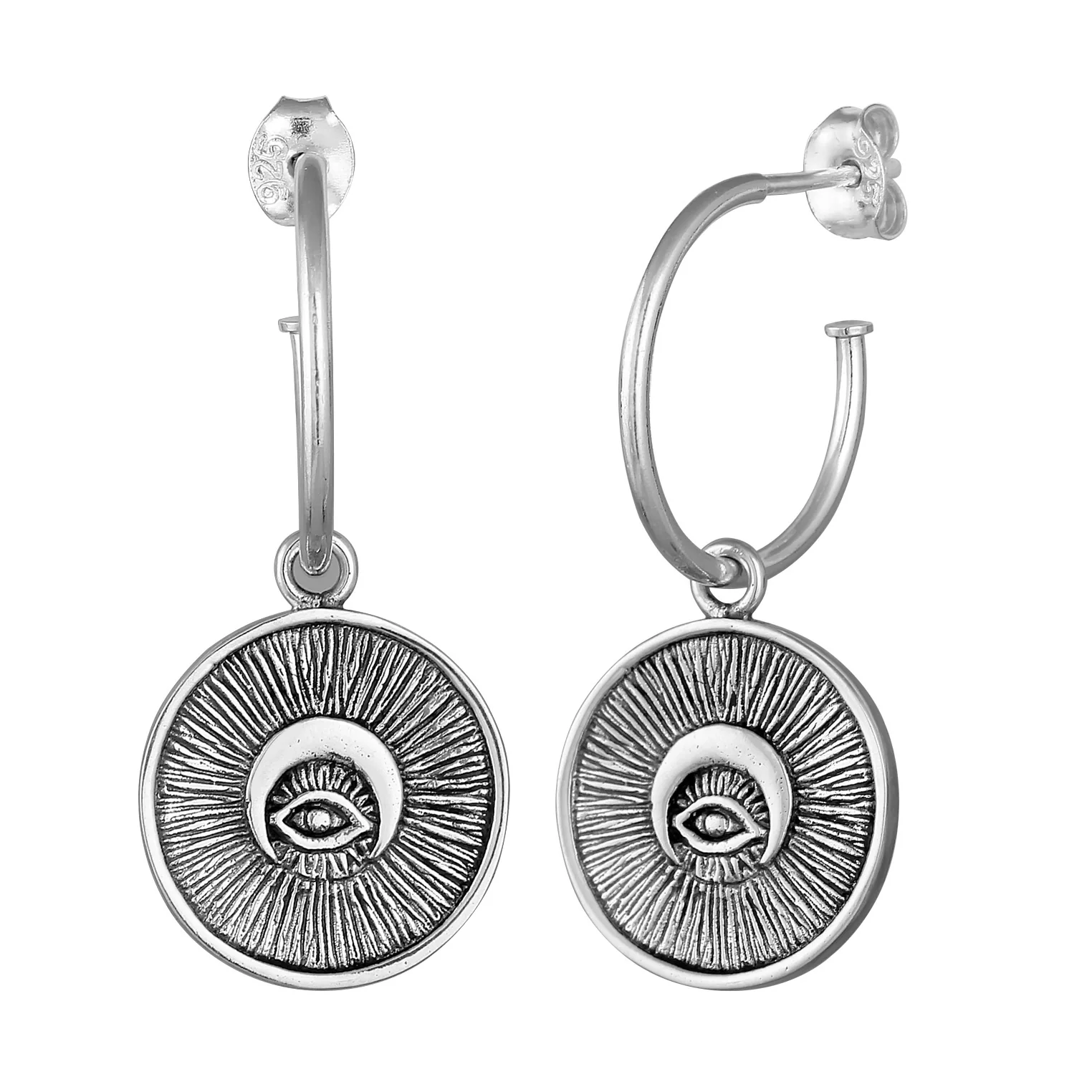 Die Sun Ohrringe sind aus oxidiertem 925 Sterling Silber gefertigt. Der Anhänger der Sun Ohrringe hat den Umfang von 1,7cm.