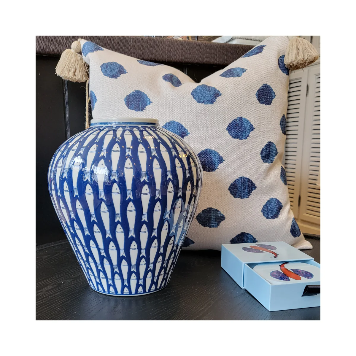 Die Fancy Home Collection präsentiert stolz diese wunderschöne Keramikvase in blau-weiß mit einem einzigartigen Fischmotiv.