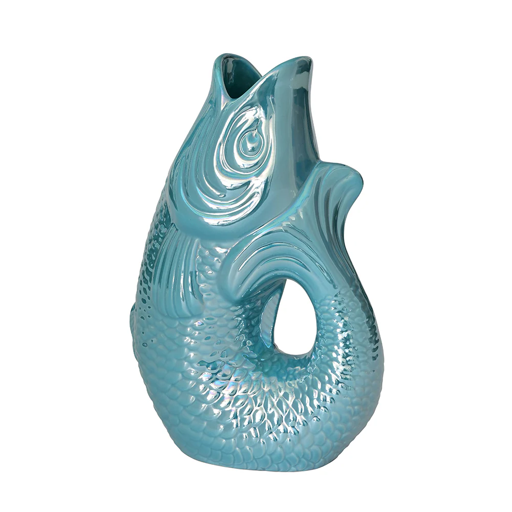 Bonjour heißt es mit unserem Monsieur Claude! Die Vase wurde einem Fisch naturgetreu nachempfunden, sodass sie zu einem tollen Hingucker in Deinen vier Wänden wird. Der liebe Monsieur Claude überzeugt besonders durch seine schimmernden Schuppen in Meerblau! Nicht nur für Fans des Maritimen ist das was! Die schöne Fisch-Vase hat eine Größe von 25 x 16,5 x 8,5 cm und besteht aus Steingut.