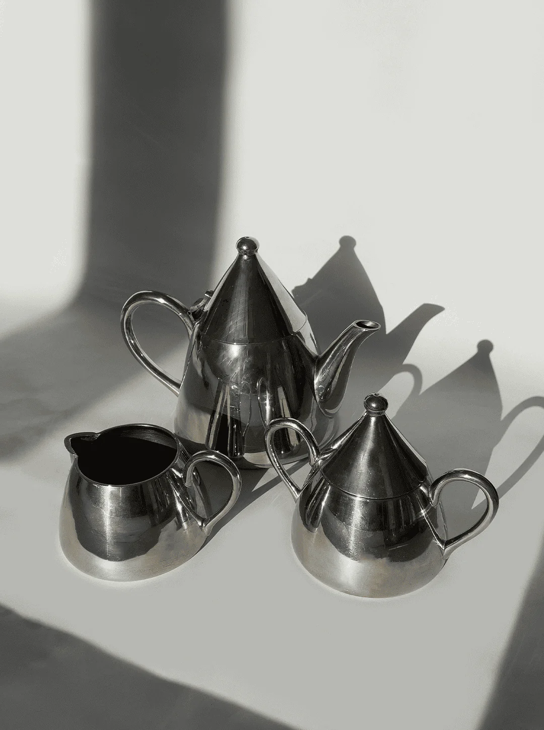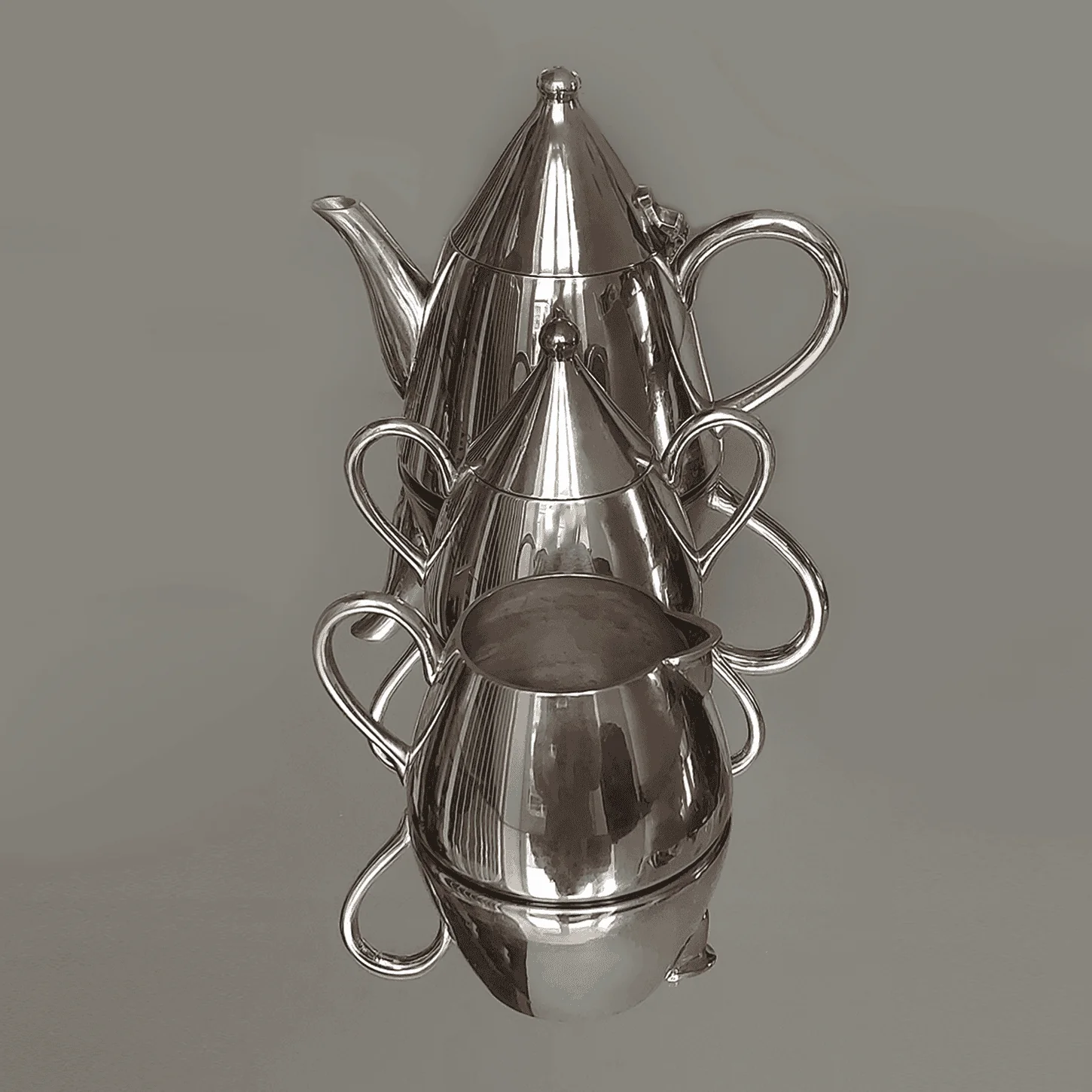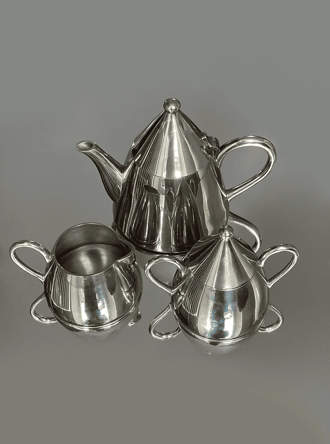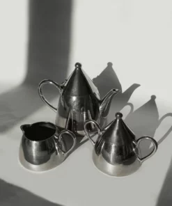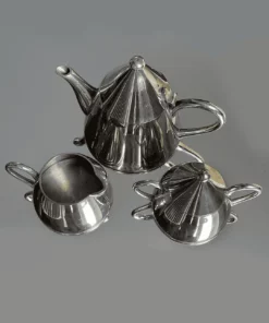 Dieses elegante Tee- oder Kaffeeset besteht aus einer Teekanne, einer Zuckerdose und einem Milchkännchen. Gefertigt aus hochwertigem Metall, besticht es durch seine edle silberne Farbe. Perfekt für stilvolle Teestunden oder Kaffeepausen.