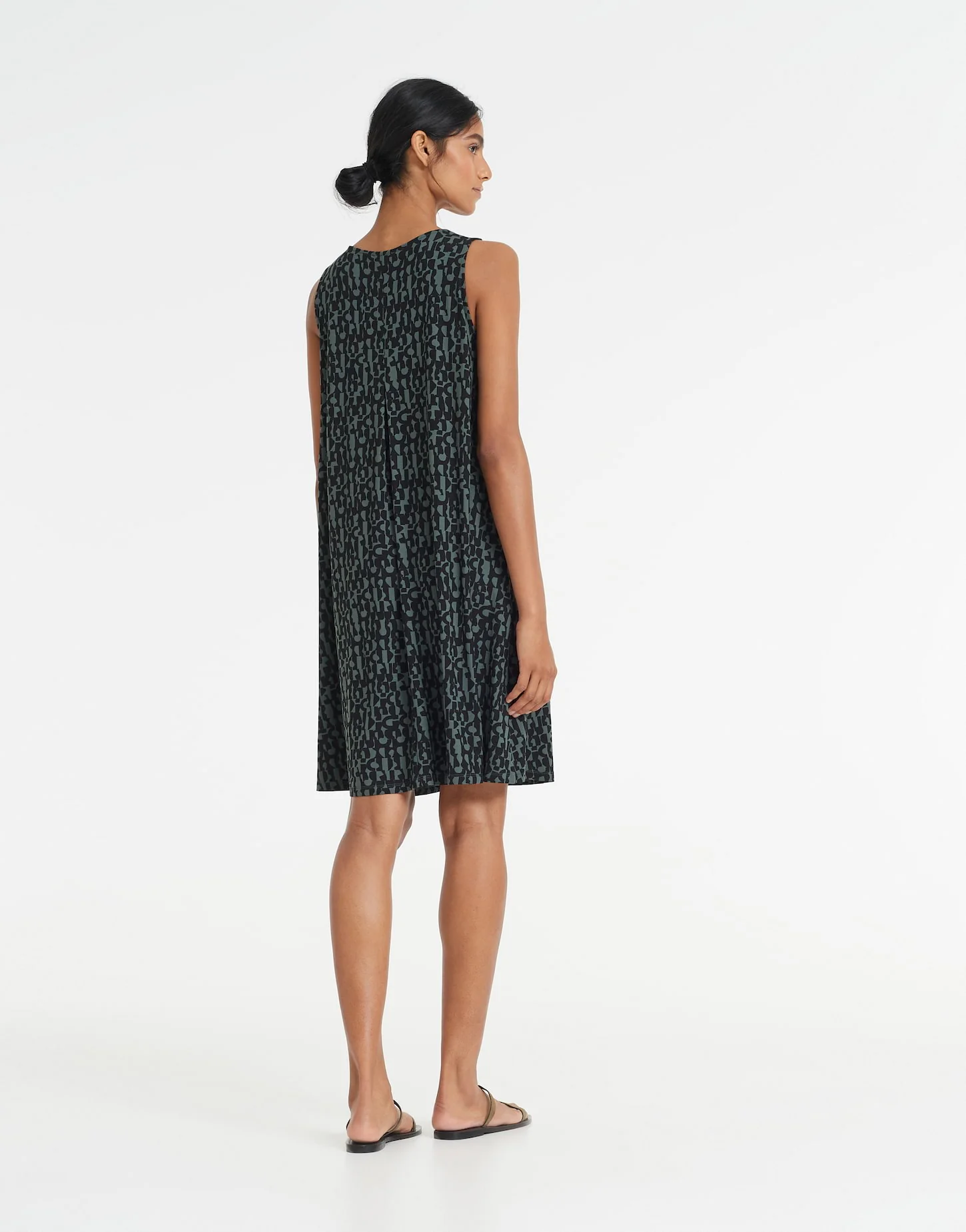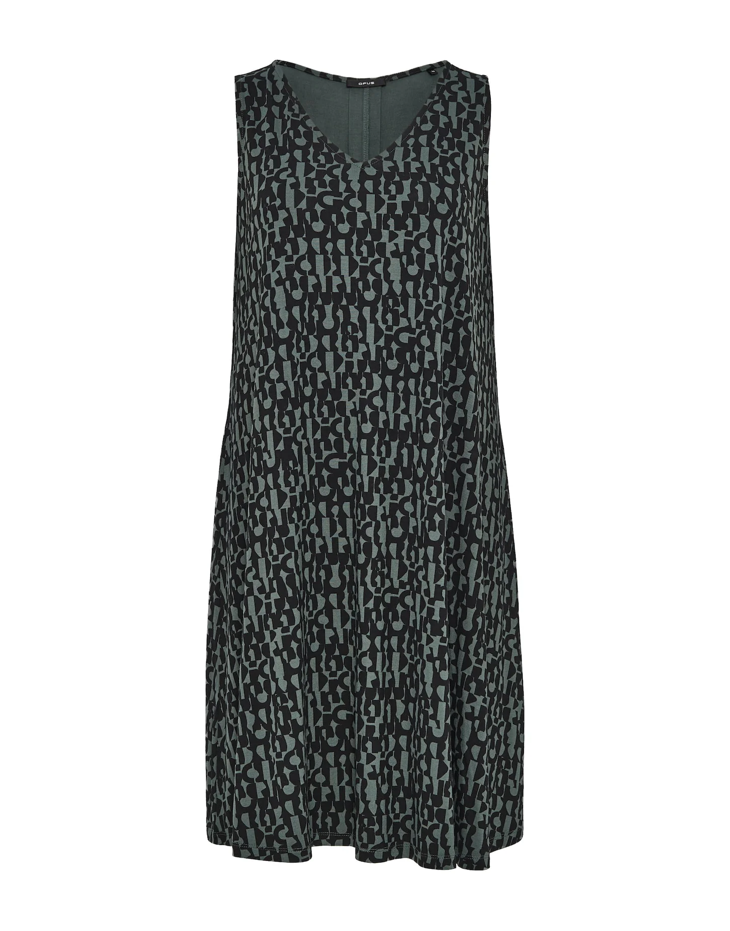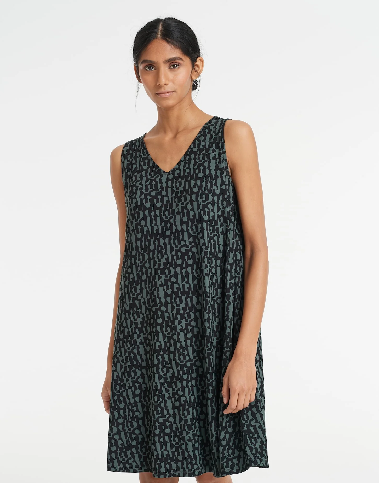 ECOVERO™ Viskose Mix, kleiner All-Over-Print, A-Linie, kurz geschnitten, V-Neck, schwingender Fall, Längsnaht mit Falte im Rücken für mehr Volumen, das Model ist 176 cm groß und trägt Größe 36