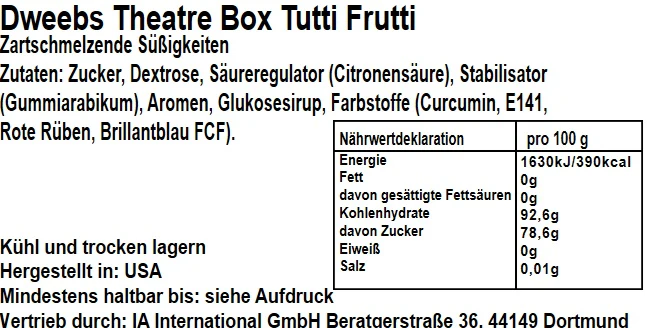 Zutaten: Zucker, Dextrose, Säureregulator (Citronensäure), Stabilisator (Gummiarabikum), Aromen, Glukosesirup, Farbstoffe (E100, E141, E162, E133).