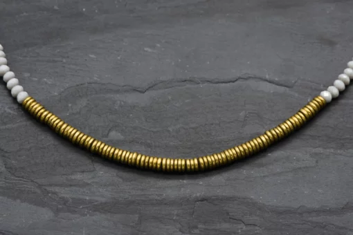 Die Halskette aus Messing- und Calcitperlen ist ein einzigartiges Accessoire und eine aufregende Erweiterung deiner Schmucksammlung. Trage die Kette zum Alltagsoutfit oder zu einem besonderen Anlass – sie wird ganz sicher viele Blicke auf sich ziehen.